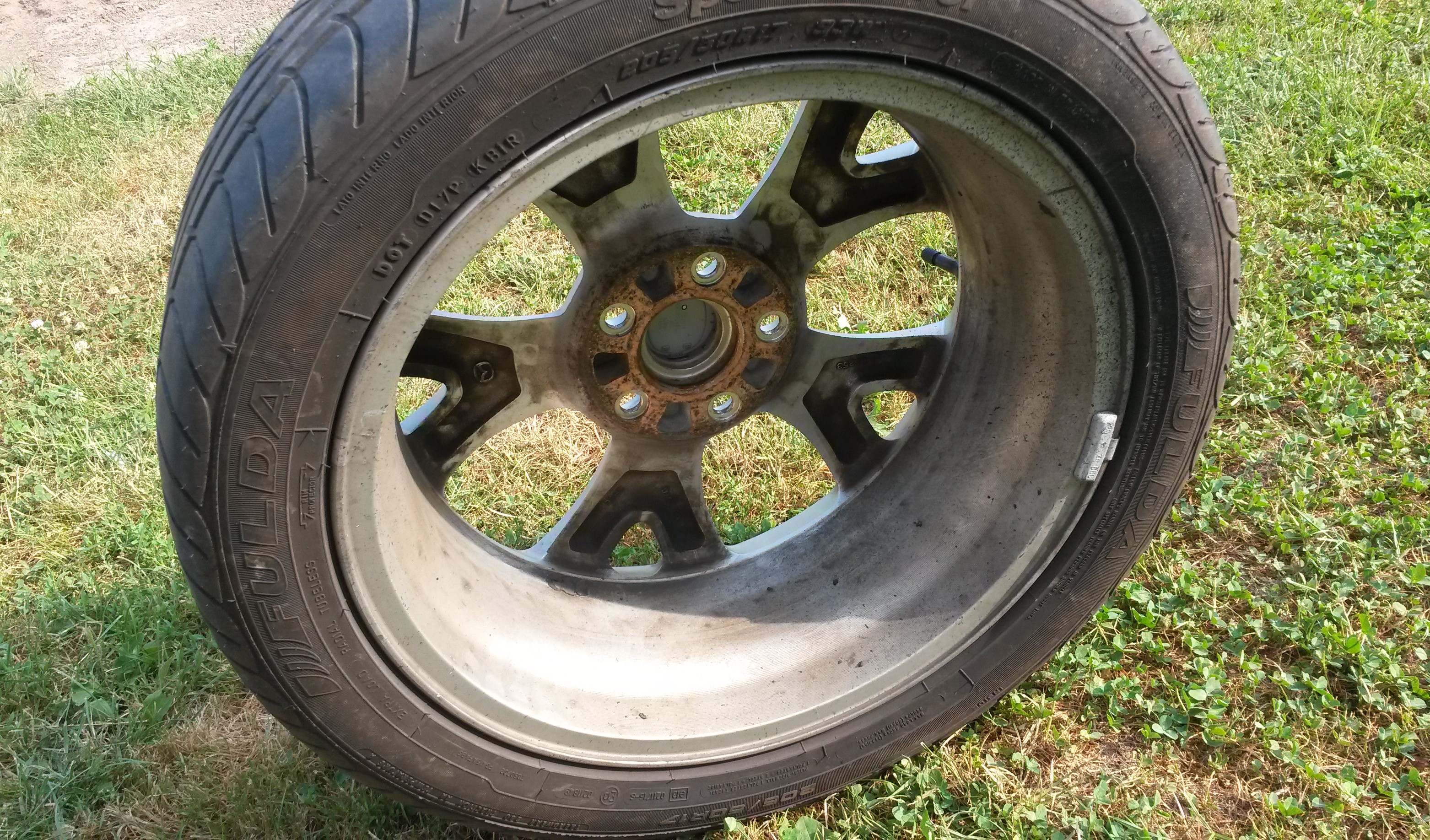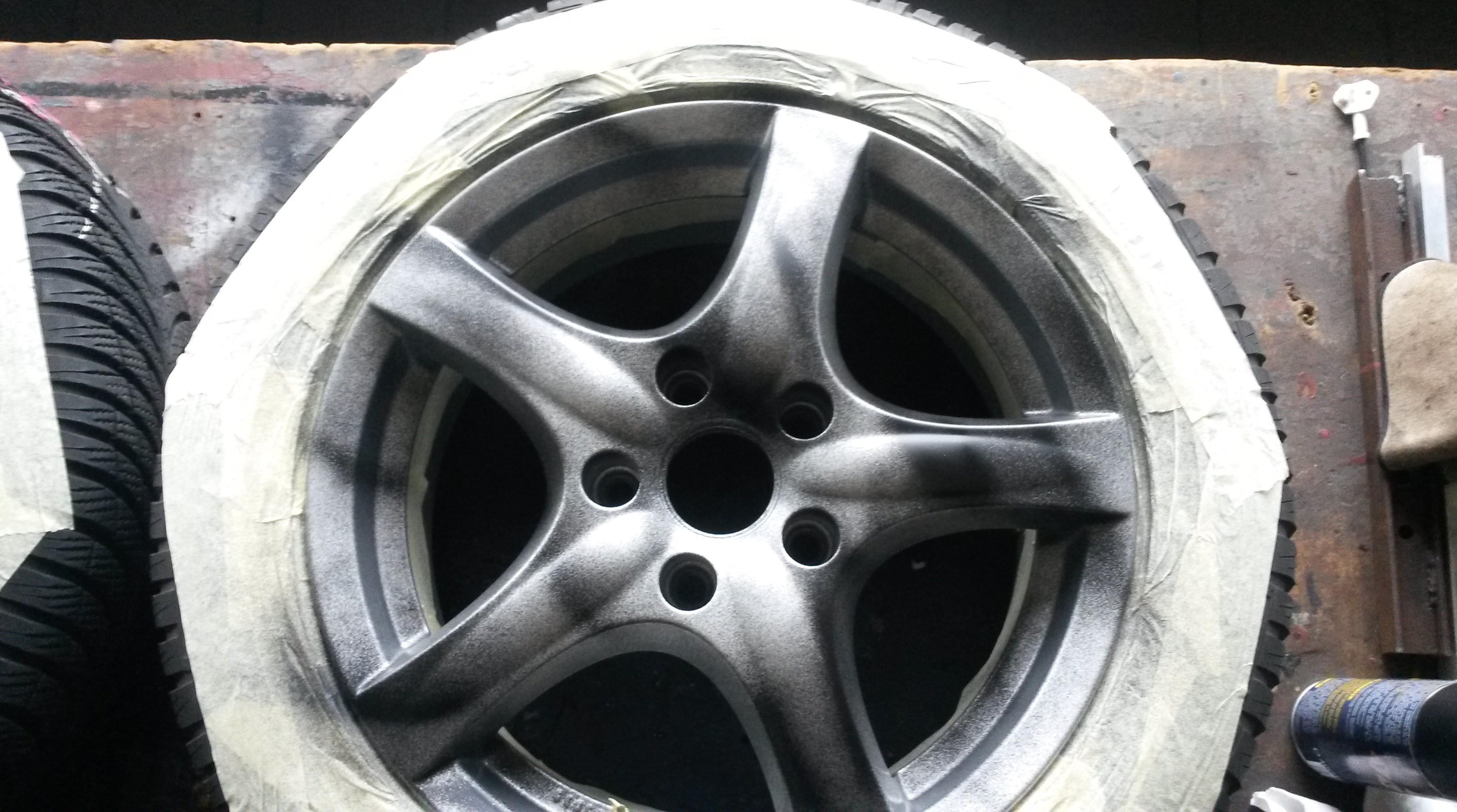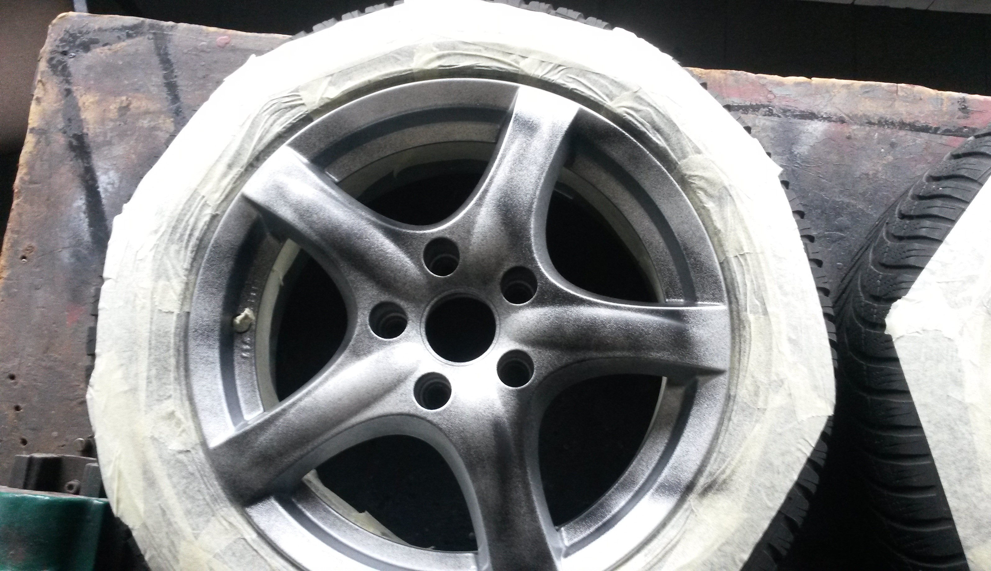 Wcześniej dałem felgę do naprawy i malowania (uszkodzona przez poprzedniego właściciela). Ponieważ nie dało się dobrać idealnie koloru do oryginału zostały pomalowane dwie, które idą na jedną stronę auta.
