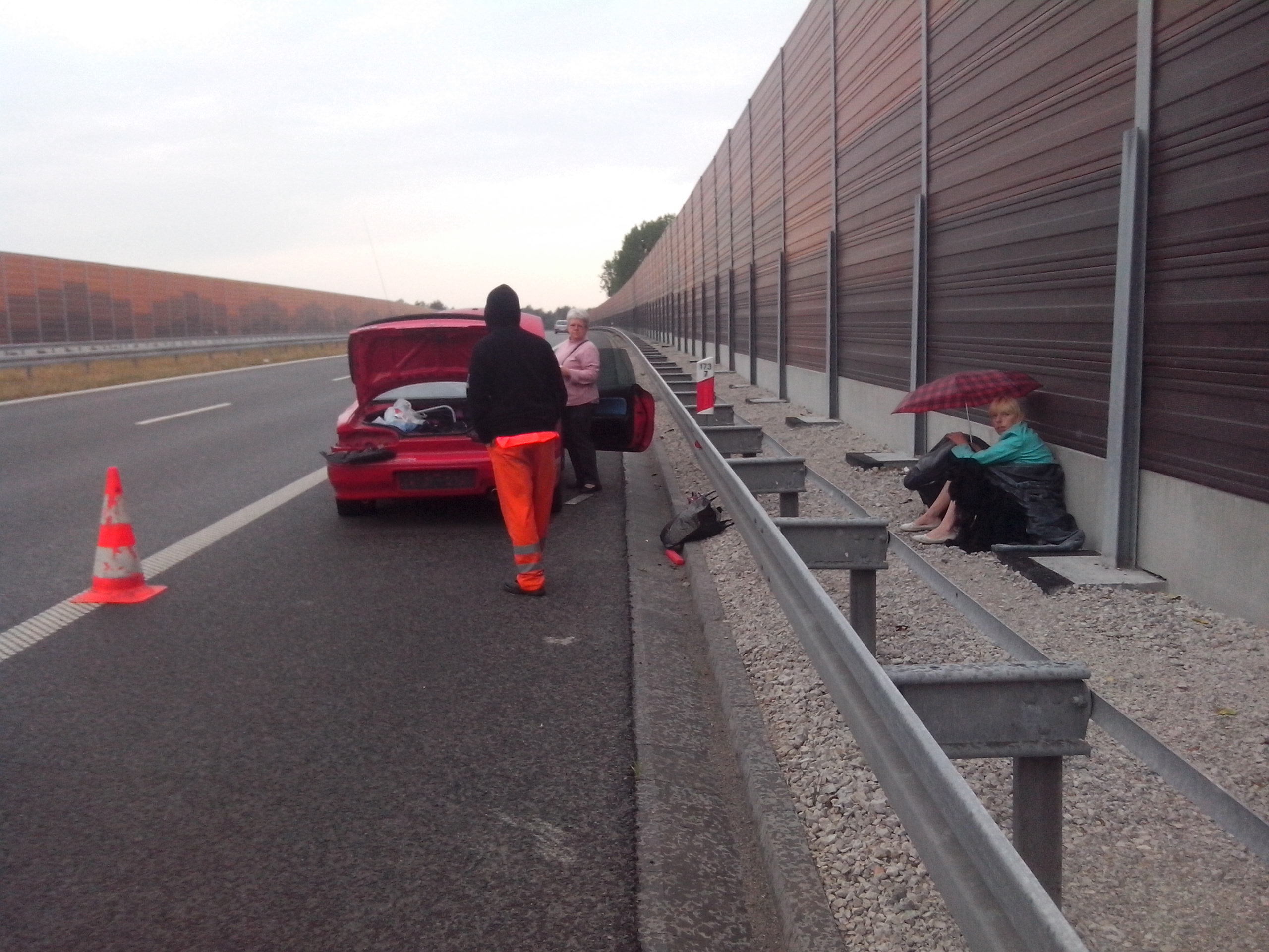 w Drodze Łódź-Ustka na odcinku Włocławek, wraz z mężem, miesięcznym dzieckiem (dziś skończyła miesiąc) oraz teściową i naszym psem. Po godz 5.30 na autostradzie A1 stanelismy na poboczu z przyczyn od nas nie zaleznych ponieważ cos strzeliło w tłumiku i samochód poprostu zgasł