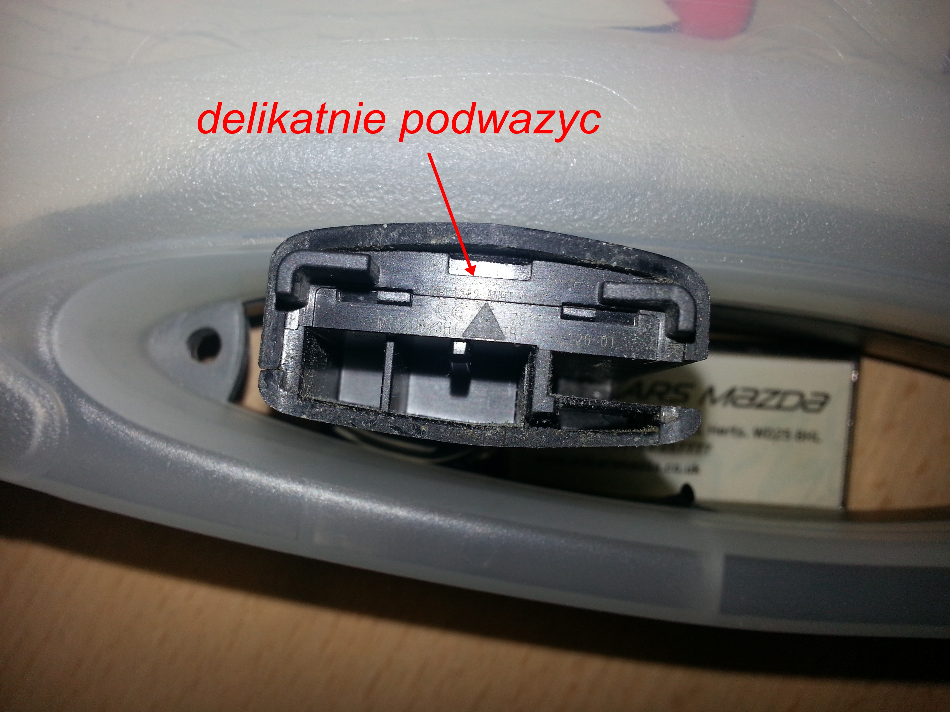 2. Strzalka wskazuje maly zaczep, ktory nalezy wcisnac i zarazem rozdzielajac czesci pilota.... grot od przyciskow: