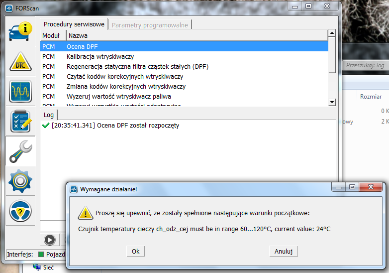Zmuszony byłem również uruchomić "Statyczne Dopalanie DPF". Uważam że przebiegło ono inaczej/spokojniej niż gdy kiedyś próbowałem "na kabelek". Po uruchomieniu procedury PCM podniósł obroty do zaledwie 1800rpm i utrzymywał te obroty przez cały czas trwania zabiegu. Silnik pracował dość przyjemnie, nie było nadmiernie słychać klekoczących wtrysków i rzegoczącej turbiny. Trochę głośniej było tylko przez ostatnie 3 minuty gdy procedura schładzała DPF. Po 61 minutach proces się zakończył. Niestety nie wiem jaki był komunikat na koniec w Forscanie bo bateria w laptopie mi siadła