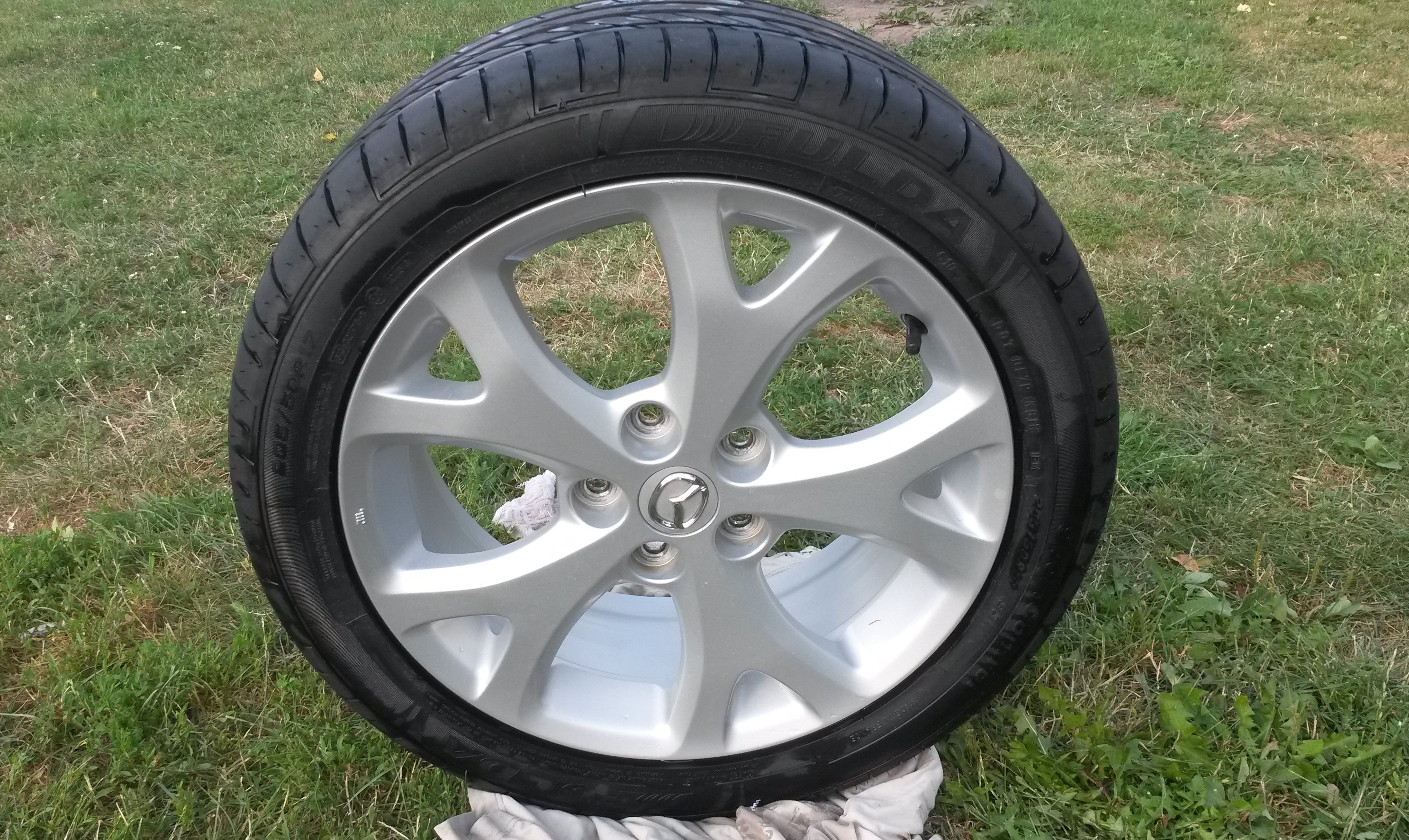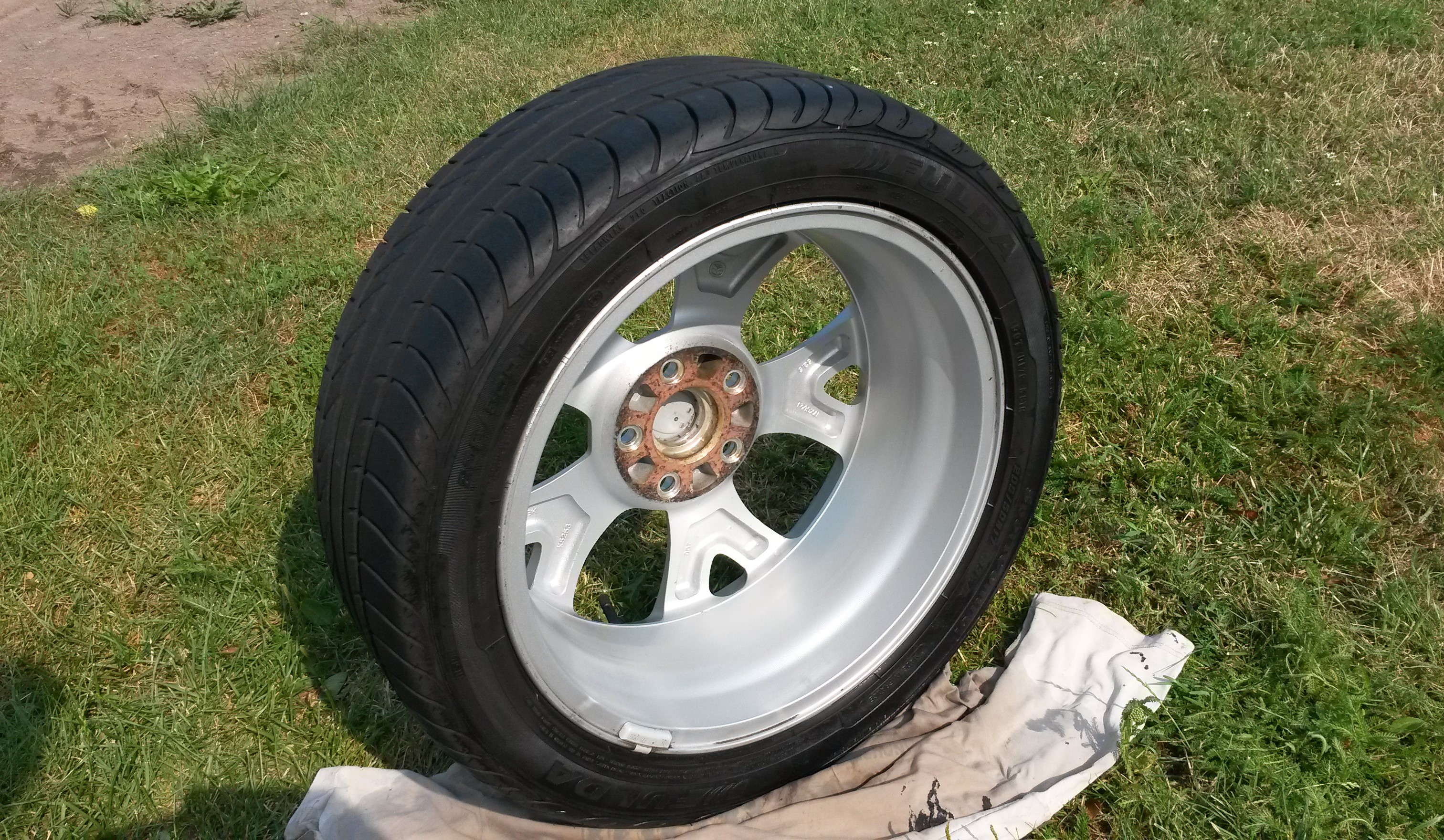 Wcześniej dałem felgę do naprawy i malowania (uszkodzona przez poprzedniego właściciela). Ponieważ nie dało się dobrać idealnie koloru do oryginału zostały pomalowane dwie, które idą na jedną stronę auta.