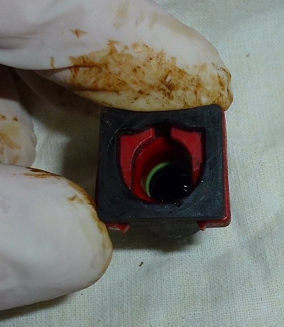 jeśli już skończyliśmy nalewanie, zakładamy zatyczki na rurkę i wpychamy ją najgłębiej jak się da a następnie dociskamy czerwoną zapinkę aż dojdzie do końca i zablokuje się tak jak na zdjęciu nr 4 od góry. Gdyby nam się jakaś zapinka uszkodziła, spokojnie możemy zakleić je na taśmę lub dokupmy je w ASO, symbol całej zatyczki widoczny jest na jednym z powyższych zdjęć.
