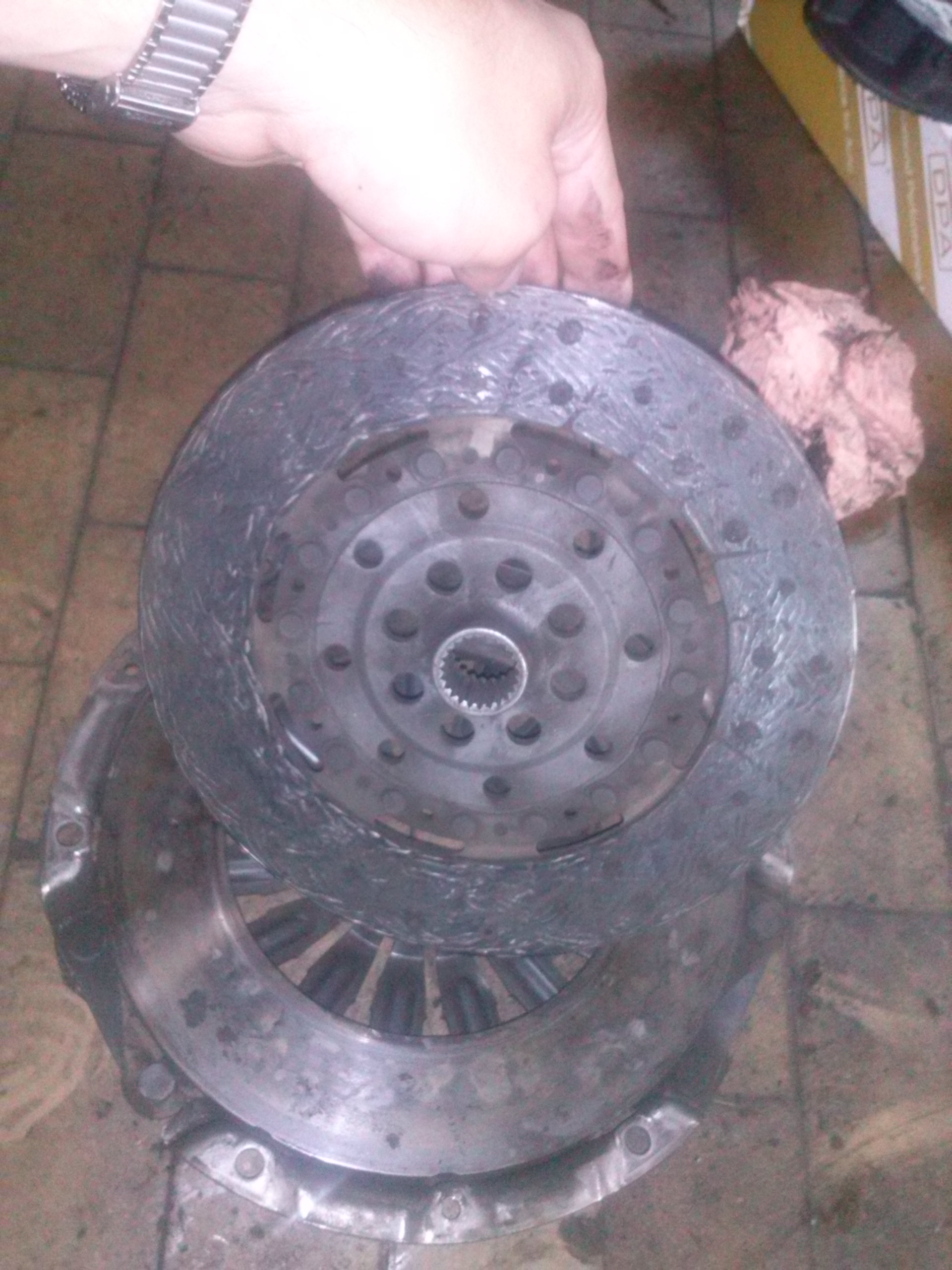 2) Ponadto sprawdzili, że w sprzęgle tarcza jest już grubości naleśnika, a i docisk nosi ślady zużycia – sam dwumas jest w dobrym stanie, choć już lekki luz na nim jest (ok. 5 mm). Jako że ze sprzęgła i 2m nie było dotychczas żadnych objawów, to zmieniamy tarczę i docisk, natomiast dwumasa zostaje ta co była.