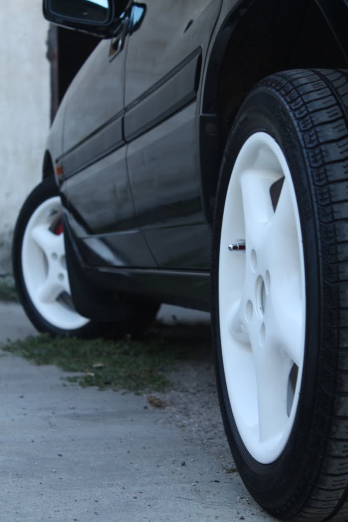 Wrzucone (przejściowo na sezon 2013) felgi 15" EXIP z oponami 195/50. Oczywiście pomalowane proszkowo na biało. :)