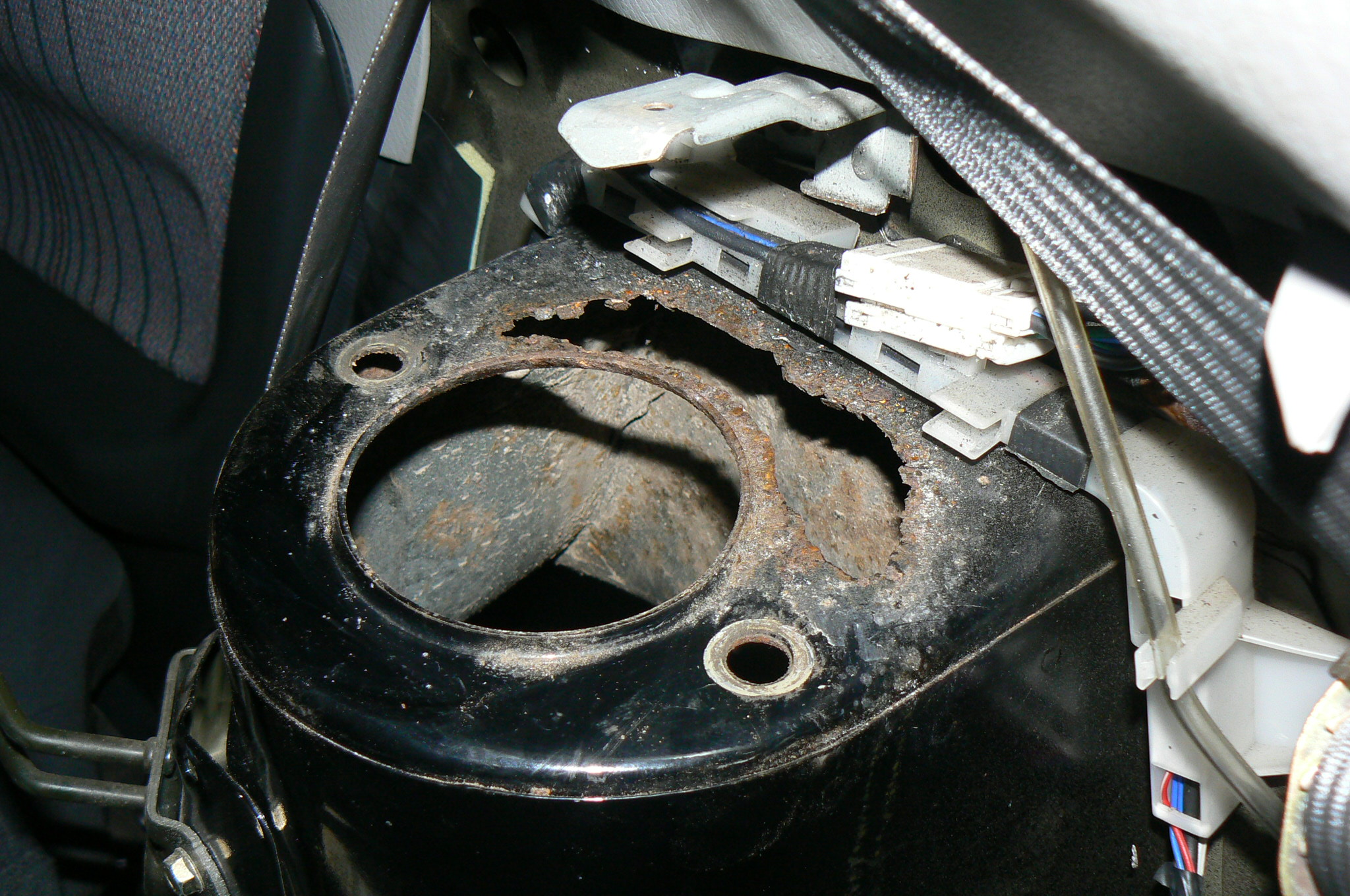 Od strony blacharskiej nie było już tak kolorowo. Progi do roboty (na szczęście nie po całości, a same tyły), kielichy z tyłu zeżarte. Standardowo dziurki w przednich kielichach na łączeniach blach. Dziura pod nogami kierowcy. Na szczęście reszta jest zdrowa. Podłużnice całe nie skorodowane itd.