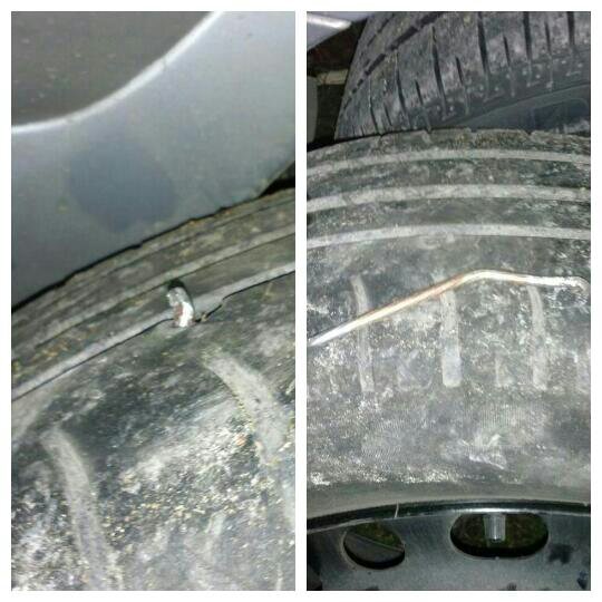 Wjazd na ulice prowadzącą do domu. Budowa sąsiada. Jego robotnikom niefortunnie wypadały gwoździe, pocięta blachodachówka na ową drogę. Dziś spotkałem się z jednym z gwoździ. [tiiit] jego mać!!