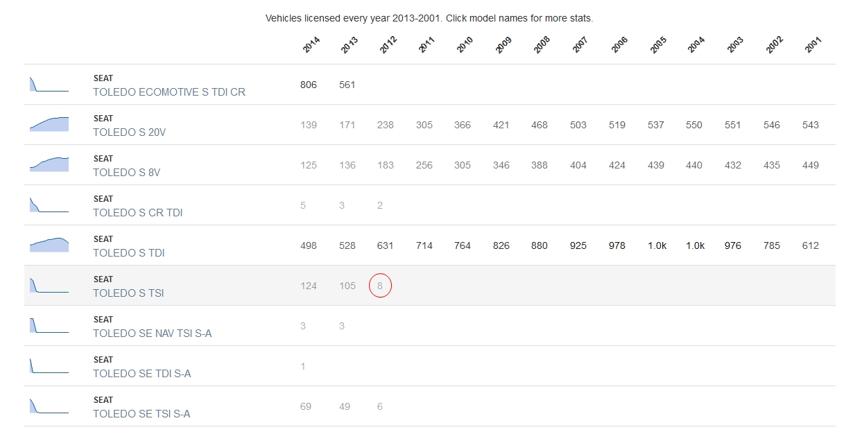 Swoją droga widać jak bardzo na mordę poleciała sprzedaż/rejestracja co chyba równoznaczne nowego Toledo-rapida, w stosunku do starego Toledo-leona. No i po 2004 roku jaki to jest niby Toledo 20v?