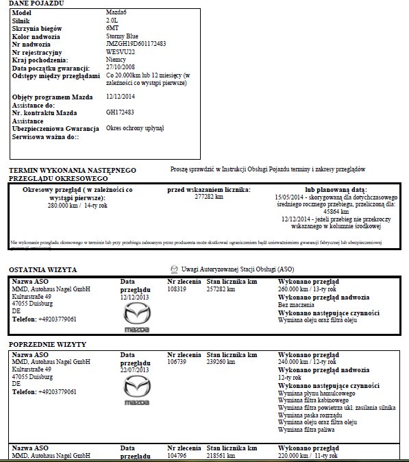 Ostatni przegląd w ASO to 12/12/2013 rok, stan licznika:257282