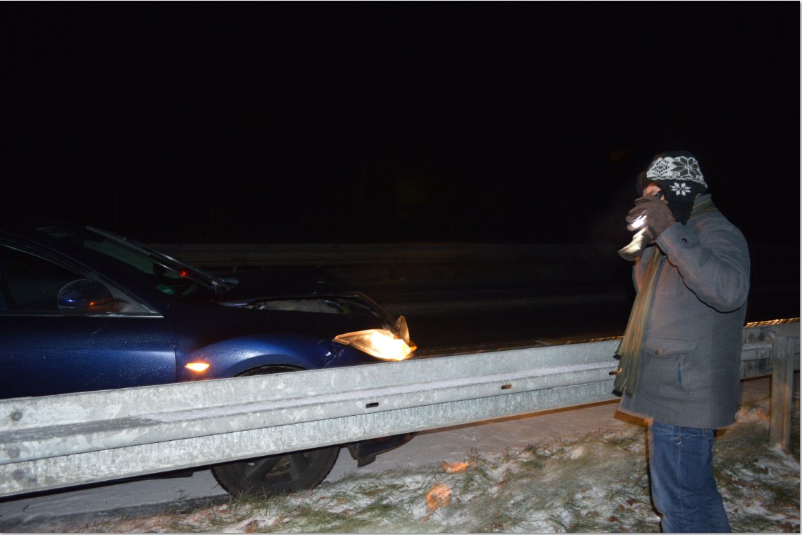 Uderzenie nie było mocne, tylko te ze nie jechaliśmy szybko nas zapewne uratowało. Co śmieszniejsze a i zal ze jak już Polizaje pojechały to po godzinie pojawiły się piaskarki