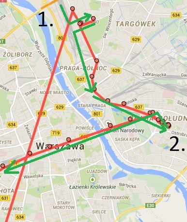 Nie miałem ładowarki więc oszczędzałem baterie, dlatego mijając Grójec wyłączyłem go. Później włączyłem w pkt. 1 (przeskok linii z dołu mapy na górę – teleportacja ehhe). Kilku minutowy przystanek i cel. pkt. 2. Z niego zgodnie ze strzałką, ruszyłem dalej. To przykład stosunkowo dobrej lokalizacji z dokładnością od 10-100m.