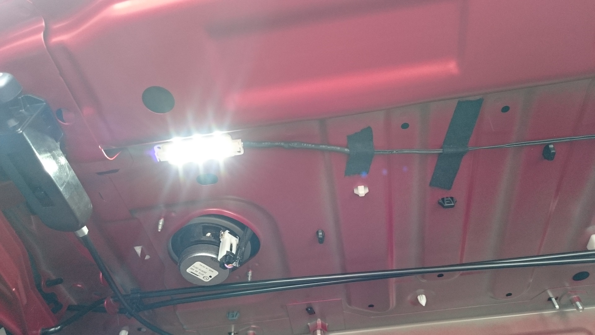 Akurat została mi z jakiegoś remonciku taśma niebieska więc ją zabudowałem na całej szerokości bagażnika. Podłączenie pod żarówkę.