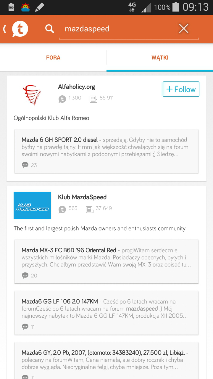 leni napisał(a):Na najnowszym TT działa. Też miałem problem ze znalezieniem naszego forum ale się udało :mrgreen: Spróbujcie tak: w wyszukiwarce TT wpiszcie "mazdaspeed" i szukaj. Następnie przełączyć na szukanie w wątkach i na samej górze wyskoczy wam nasze forum. Potem tylko dodać i działa:P w moim przypadku działa bez problemów