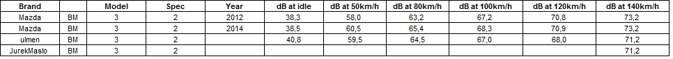 Poniżej pomiary z bazy "hałasu" (http://www.auto-decibel-db.com/index.html)