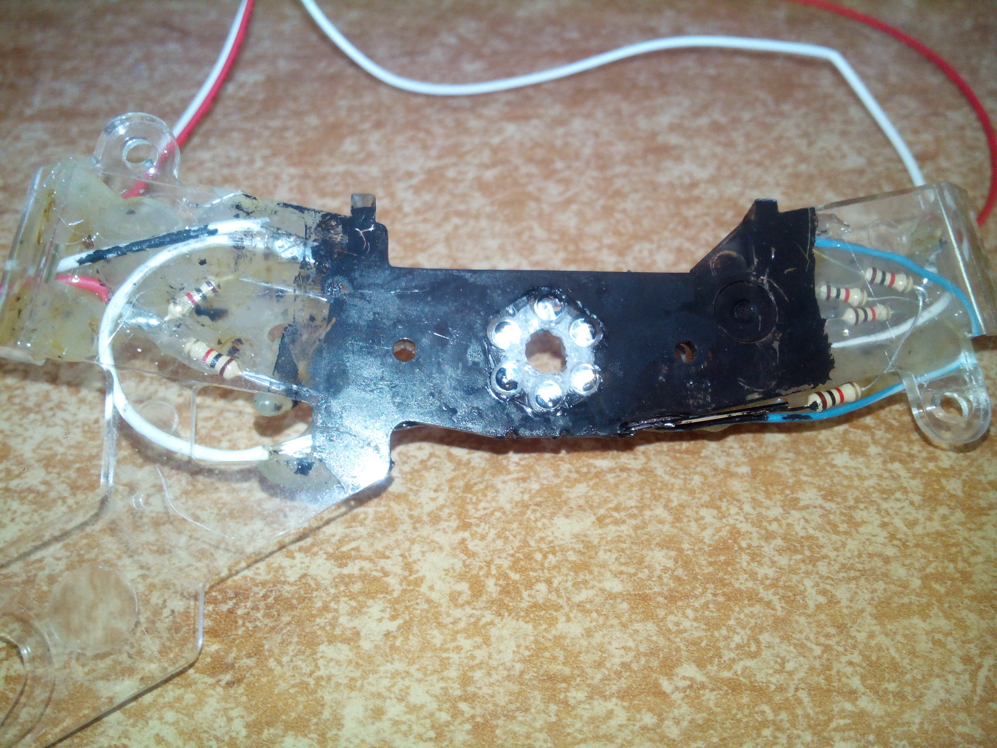PS. Na zdjęciu jest pokazana pierwsza wersja podświetlenia wskazówek którą musiałem zmienić, oporniki zostały przeniesione w inne miejsce a odpowiednie napięcie podane cienkimi przewodami, ponieważ zasłaniały one światło z białych ledów i na prędkościomierzu 60 i 200 były zaciemnione.