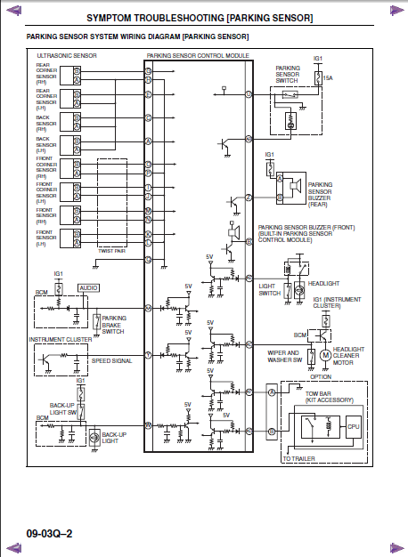 Czy lampka na wyłączniku czujników parkowania świeci się światłem ciągłym, czy mruga? Z tego co widzę w manualu, to do do sensora parkowania są podłączone między innymi przewody włącznika świateł cofania, czujnika prędkości, czujników parkowania, włącznika czujników parkowania, hamulca ręcznego, tylnego buzera oraz instalacji hala holowniczego. Występują tam też przewody od włącznika świateł i wycieraczek – nie wiem w jakim celu.
