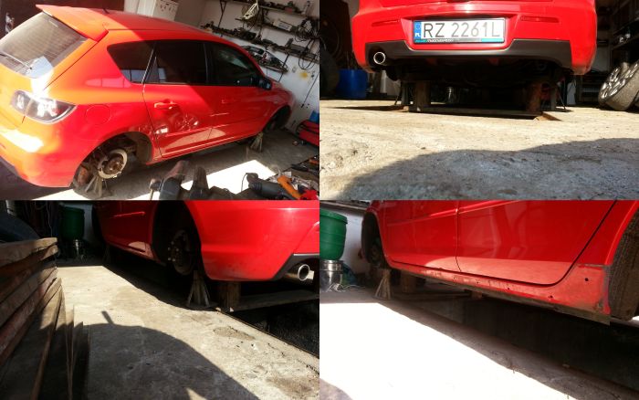 Zakres prac: postawienie na kobyłkach, odkręcenie nadkoli i plastików od spodu, wstępne czyszczenie z brudu i rdzy (rudej nie było za wiele praktycznie tylko na elementach zawieszenia),