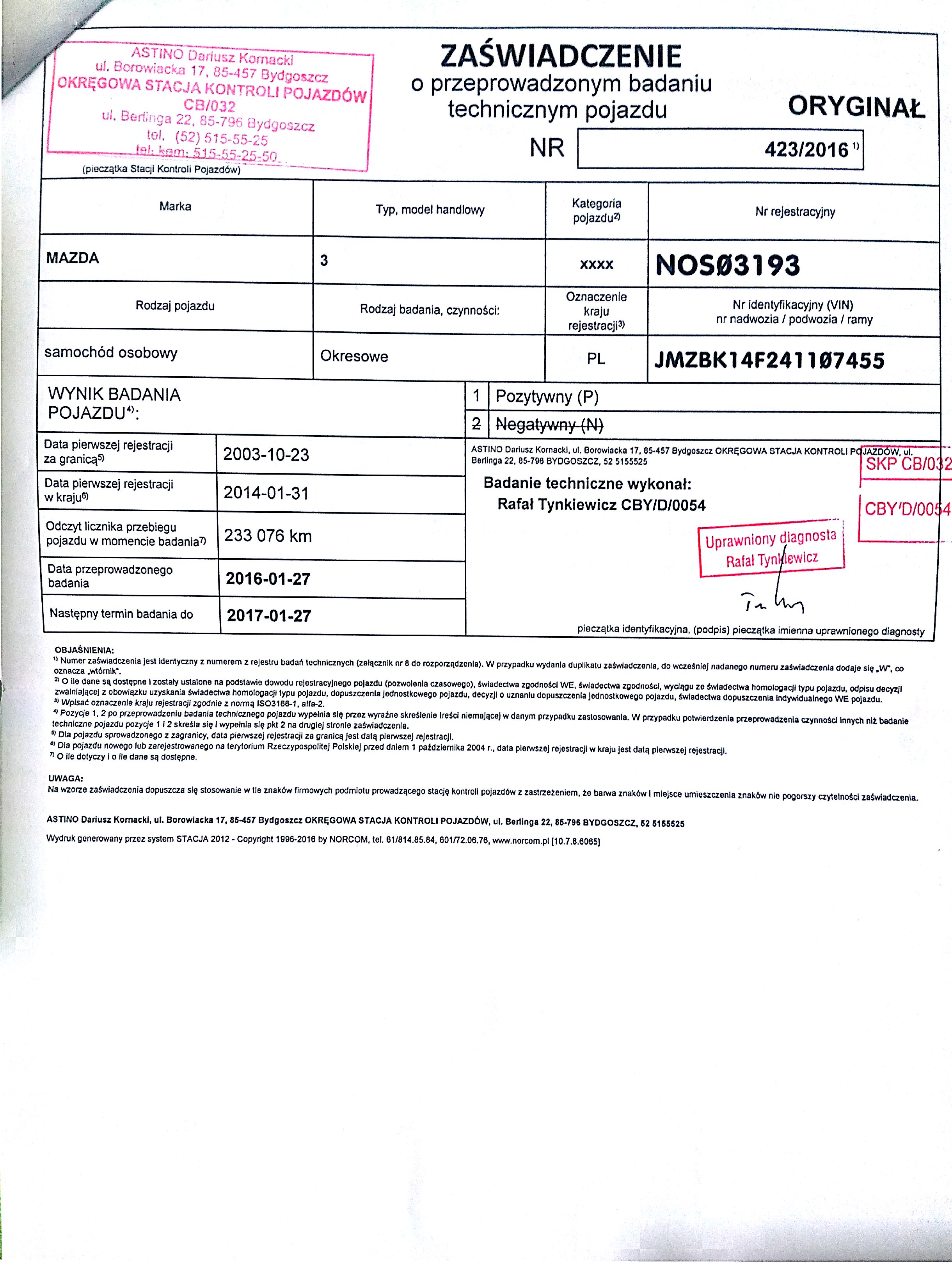 Zaświadczenie o odbytym przeglądzie rejestracyjnym – 01.2016