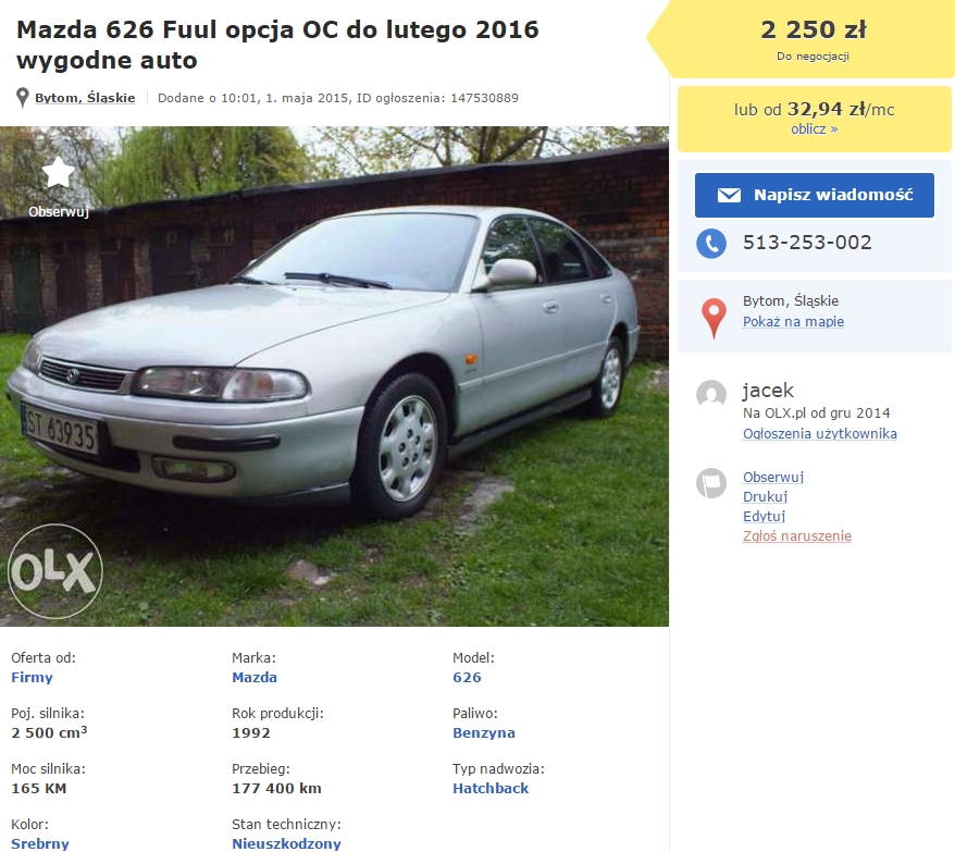 witam serdecznie, po długich poszukiwaniach pojawiła się kolejna mazda. Z opisu i ze zdjęć wydaje się ok ale najlepiej obejrzeć na żywo. I właśnie mam prośbę do osoby która mieszka w Bytomiu czy mógłby podjechać i sprawdzić czy ten silnik nadaje się jeszcze do jazdy bo jednak jechać tak daleko ( z Białegostoku) żeby dowiedzieć się o tragicznym stanie silnika ? trochę słabo, ostatnio też mi zapewniano że igła silnik a co do czego już zakończył swój żywot. Poniżej link do aukcji i screen.