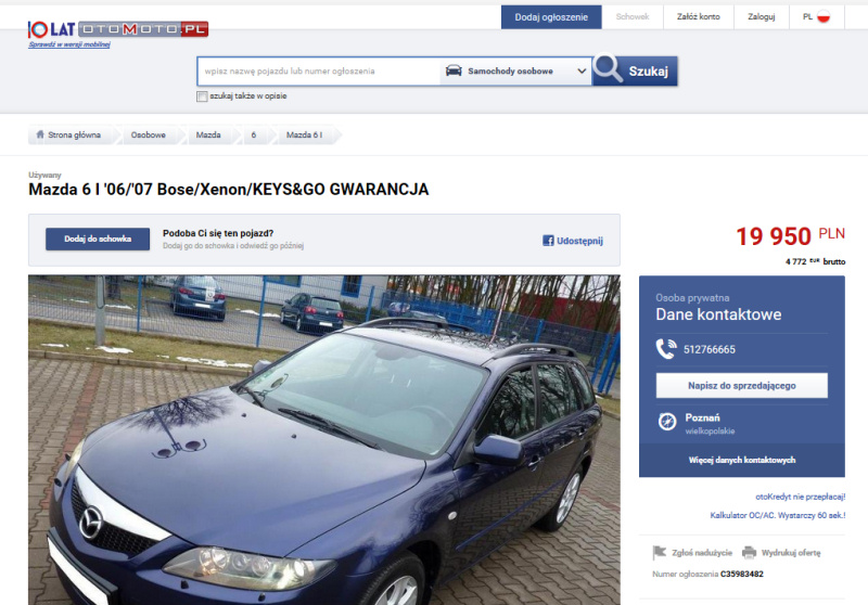 Mazda6, JMZGY193671447713, (otomoto: C35983482), REMCAR R.Kasprowiak Poznań, 512766665.