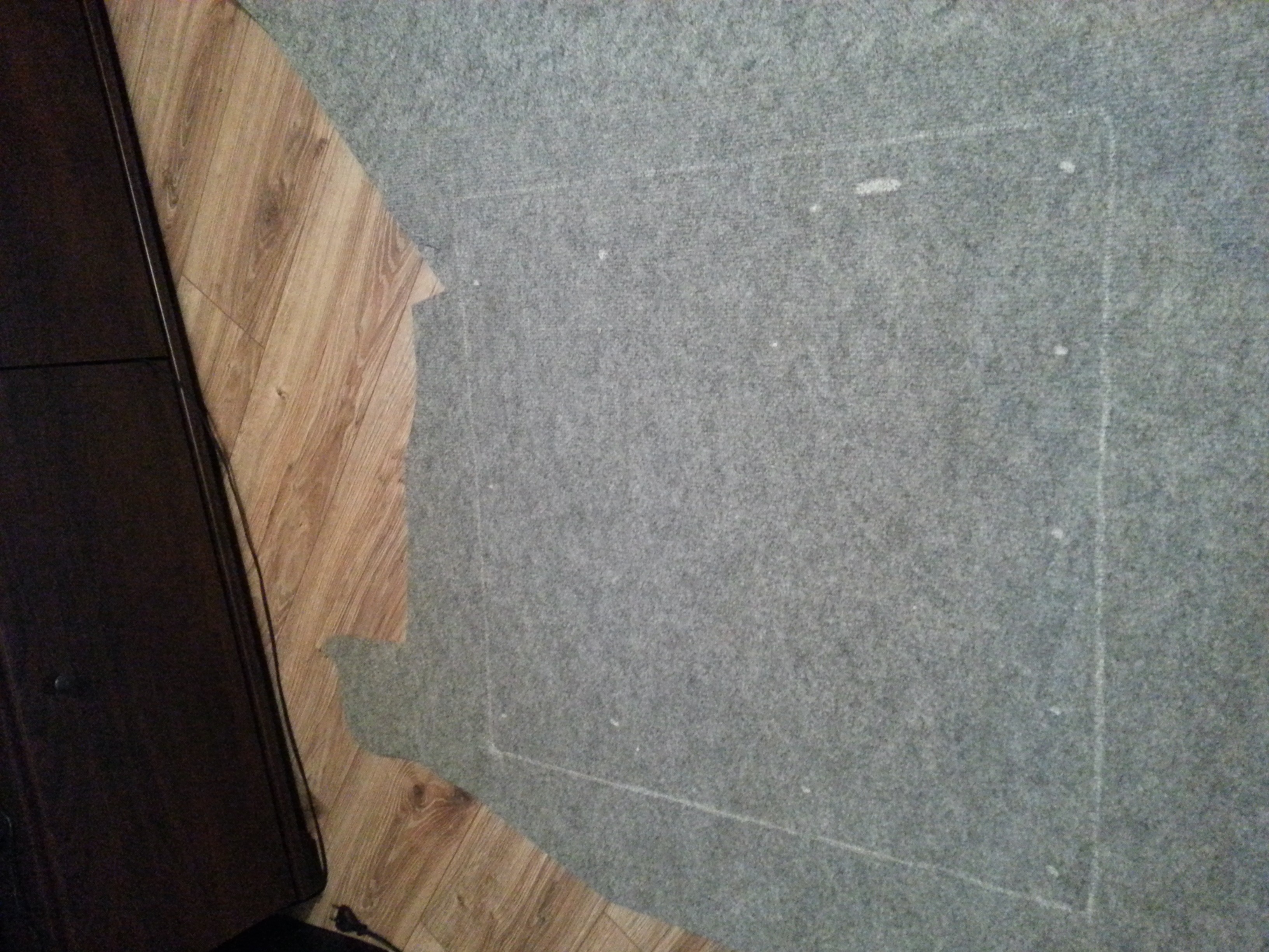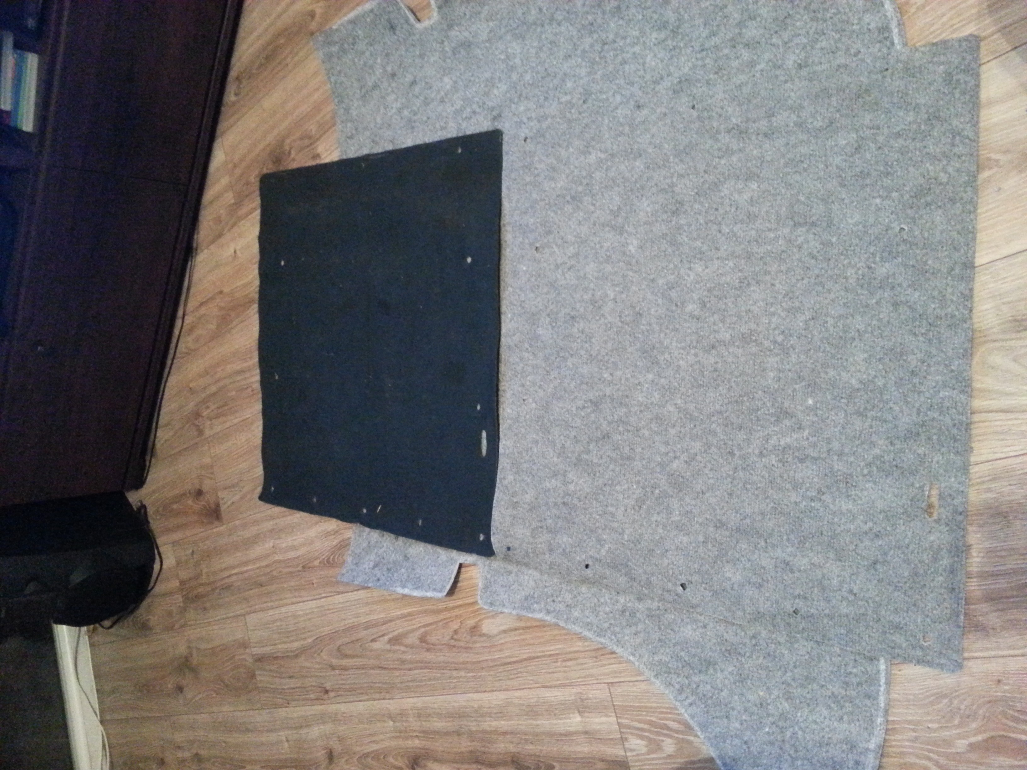 Pierwszy pomiar i obrys wykonany na podstawie dotychczasowej podłogi bagażnika okazał się być do bani i tylko zmarnował wykładzinę. Drugie podejście okazało się być bardziej udane, bowiem odrysowywałem od podwyższanej podłogi, w dodatku ze sporym zapasem na błąd. Tym razem pełen sukces