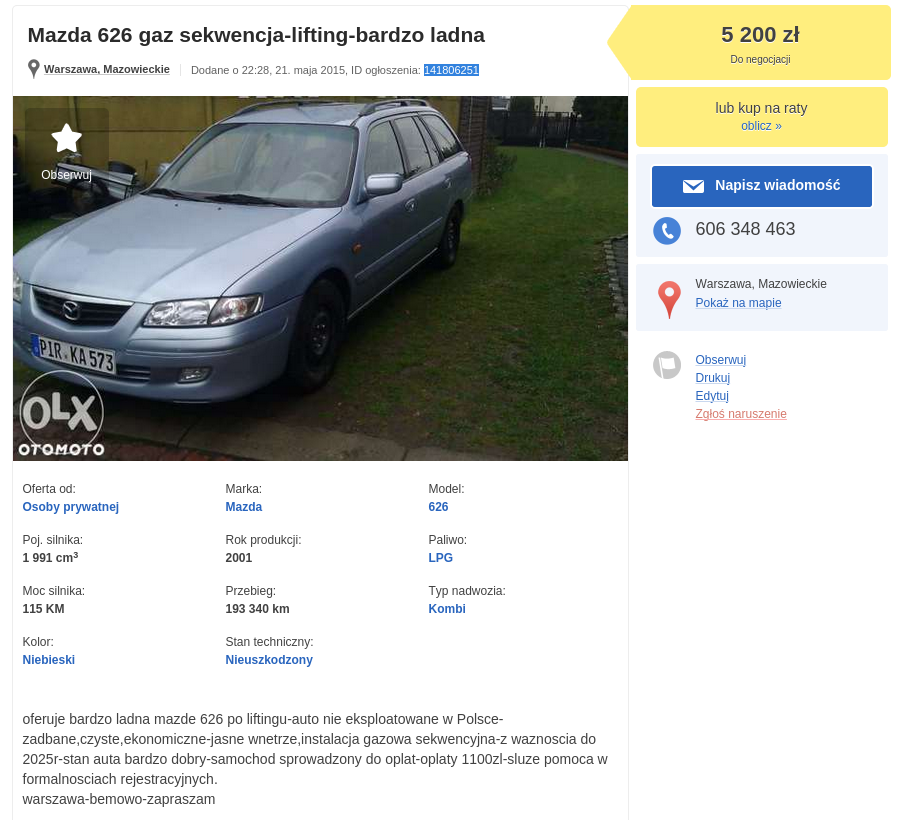 Mazda 626 2.0 Pb/LPG, 2001, (olx: 141806251), 5.200 zł, Warszawa.