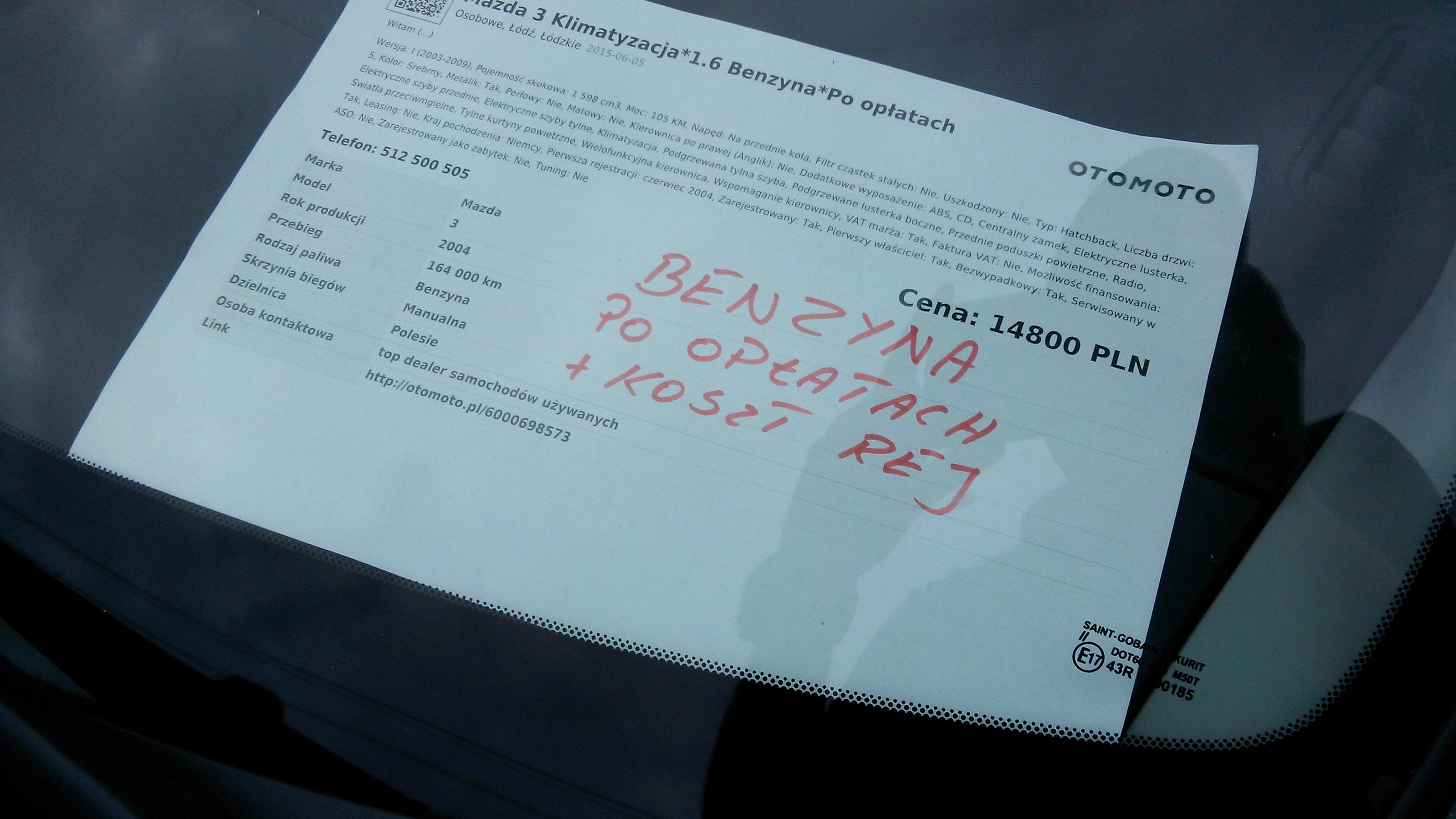 Samochód w Łódzkim komisie, na niemieckich numerach. Z tego co widziałem wszystkie szyby w oryginale z "4" na końcu (to chyba rok produkcji ?). Zastanawia mnie tylko przednia szyba, gdzie brakuje tej czwóreczki.. Pod maską wszystko wymyte i wypastowane, niestety na blasze gdzieniegdzie widoczny rudy nalot. Na pasie przednim pod maską widnieje naklejka ostrzegająca o wentylatorze. Z zewnątrz na pierwszy rzut oka nie zauważyłem śladów rdzy, jednak nie widziałem jej jeszcze pod spodem. Zapomniałem też spojrzeć na ranty drzwi od strony wewnętrznej.. W komisie zarzekają się, że samochód jest bezwypadkowy, gdzieś tam tylko zderzaki były poobcierane.. Listwa z przodu na samym dole w kolorze czarnym, czyli tak jak być powinno. Przebieg coś ponad 160 tyś., ale podchodzę do tego sceptycznie – samochód ma 11 lat i jest sprowadzony z DE :)