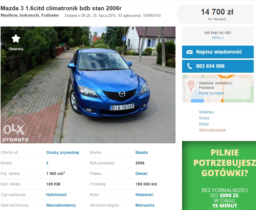 Witam, jestem zainteresowany kupnem samochodu. Znalazłem Mazdę3 z Wasilkowa koło Białegostoku, która mnie zainteresowała: