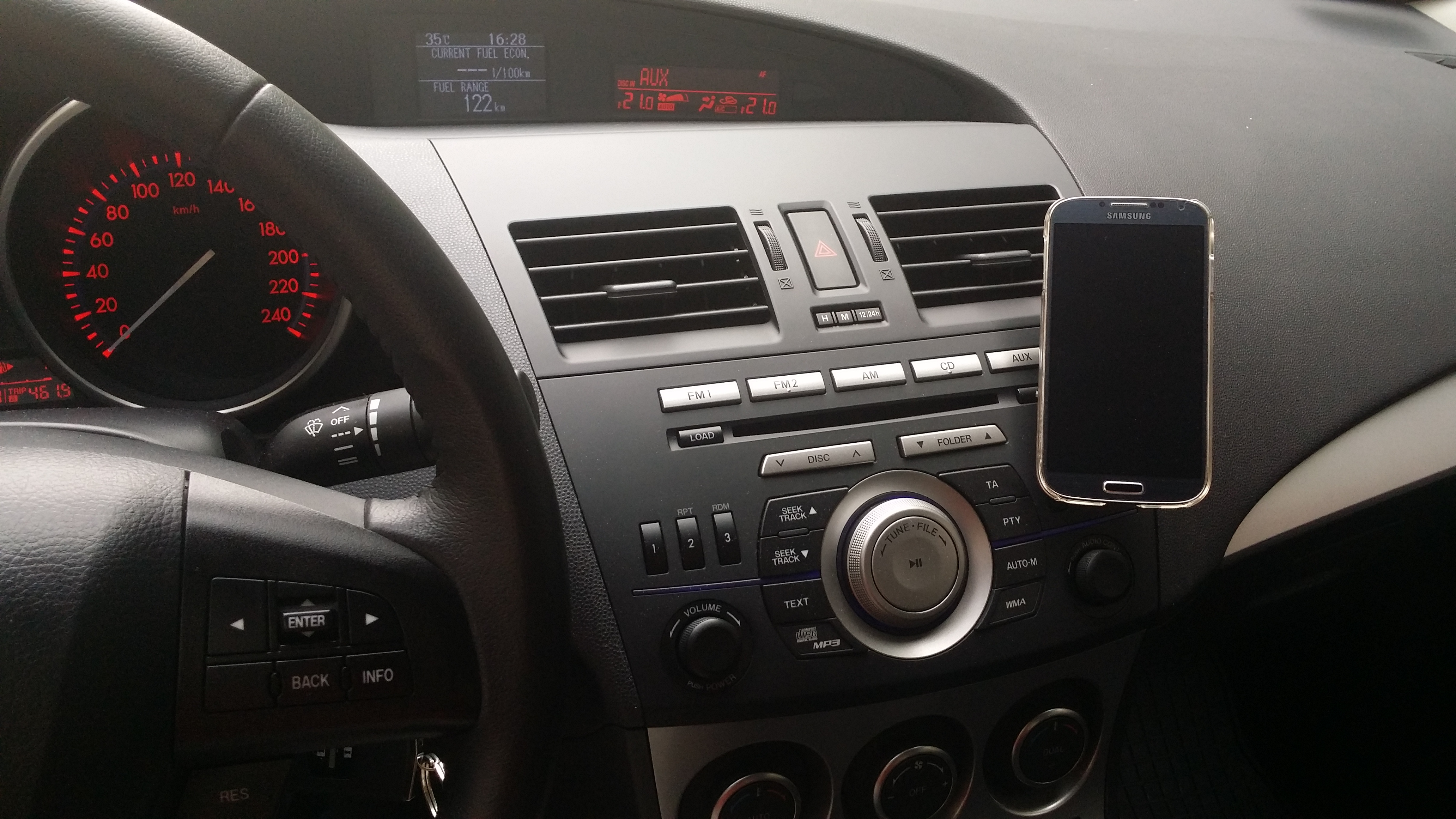 Miejsce montażu telefonu nie jest przypadkowe – wybrałem, je żeby było mi poręczniej sięgać i żeby chłodne powietrze z nawiewu chłodziło telefon – Ci co korzystali z uchwytów szybowych i nawigacji w telefonie z ładowaniem wiedzą o co chodzi. <lol> Fajne, że kulkę uczepić można praktycznie w dowolnym miejscu.