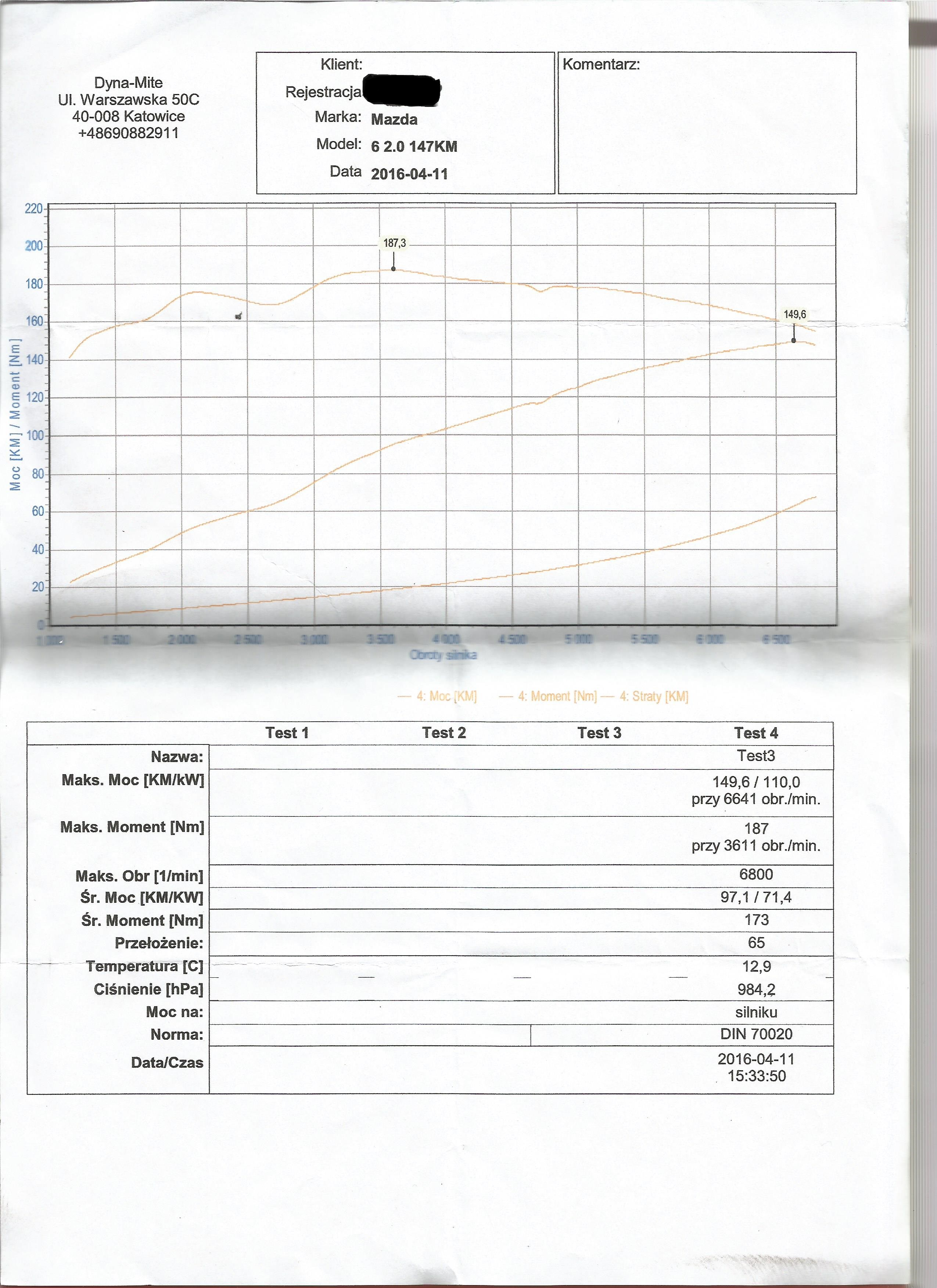 Wynik pomiaru 1: 159.3KM @ 7090rpm, 192.7Nm @ 4065 RPM