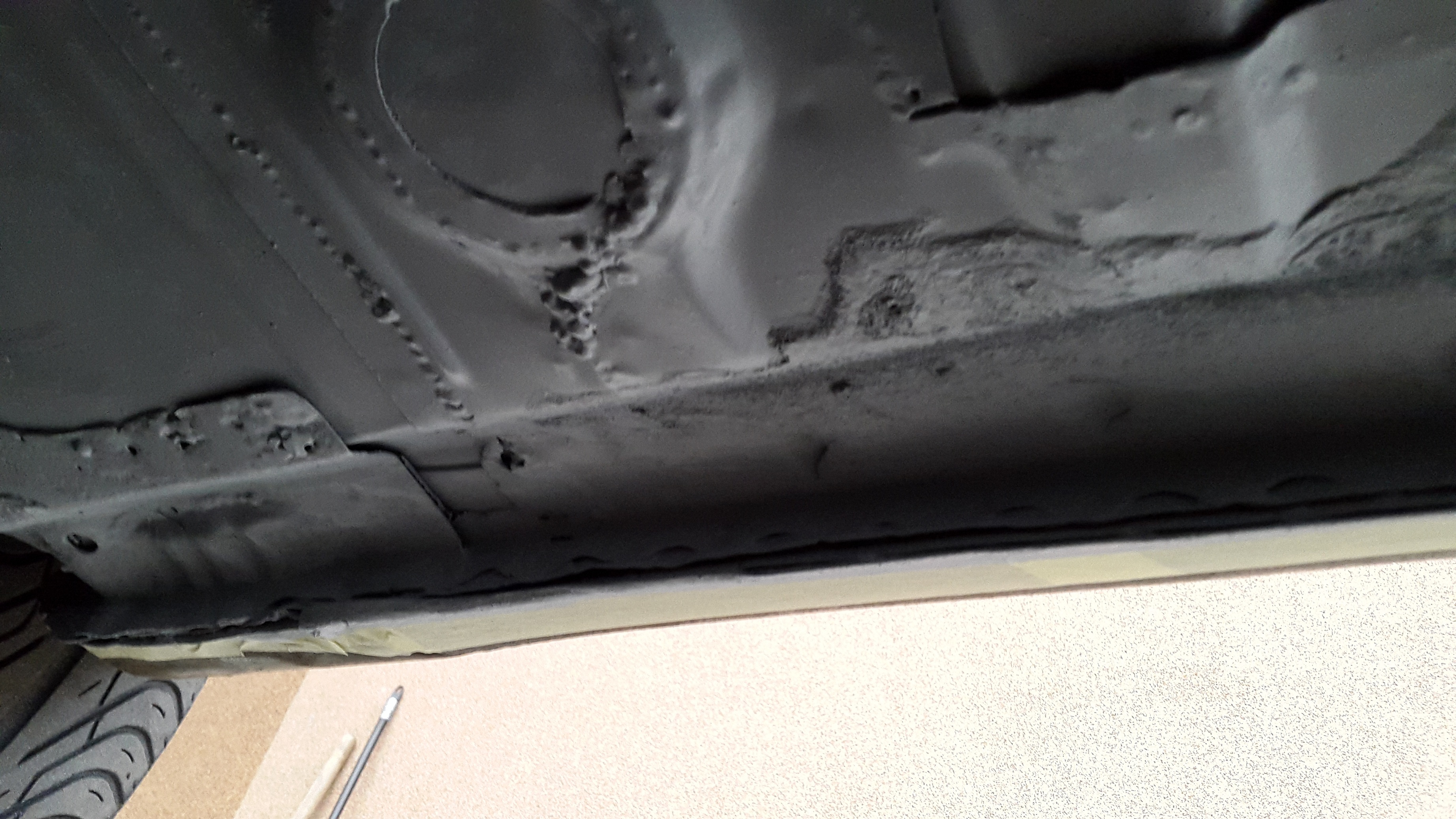 Zaległe fotki z prac nad karoserią. Oczyszczone ile się dało, pomalowane coratinem i na to epoksyd. następnie pójdzie na to pasta na zgrzewy/spawy i później konserwacja. Tył niestety jeszcze posiada kilka dziurek którymi muszę się zająć, ale wszystko to kwestia czasu