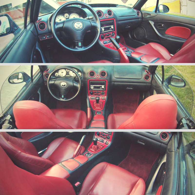 Samochód wypatrzony ze względu na bardzo ciekawe połączenie kolorystyczne i tylko dlatego zakupiony. Lakier to 22A Supreme blue mica a do tego jest czarne wnętrze z czerwonymi wstawkami (fotele skórzane, podłokietnik, obramowania nawiewów, wstawki na konsoli centralnej) i czerwony dach. Nie znalazłem informacji czy były takie wersje, czy to jakaś specjalne, więc raczej jest to zamówienie indywidualne jakiegoś Niemca. Całość jest bardzo spójna i wygląda świetnie.