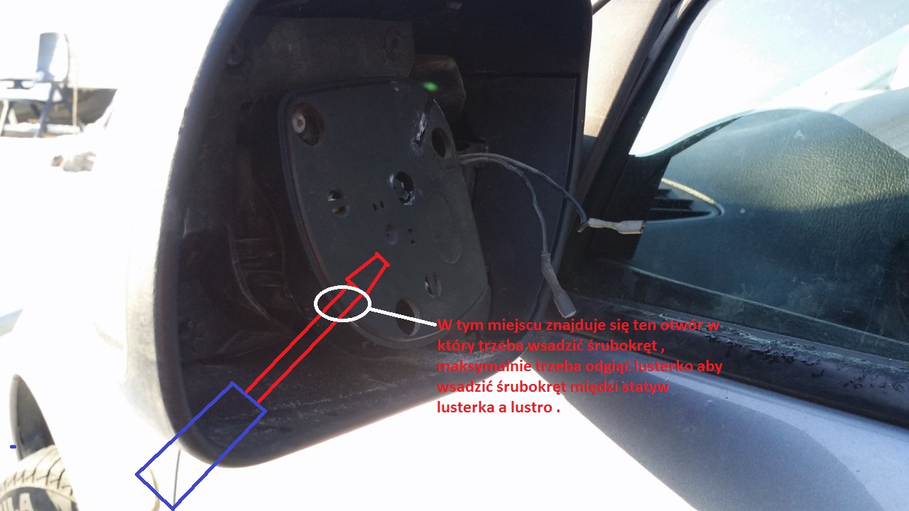 Jak rozebrać lusterko jest napisane na początku tematu , lecz niestety nie ma już zdjęć dlatego wstawię zdjęcie tego otworu w który trzeba wsadzić płaski długi śrubokręt i podważyć :