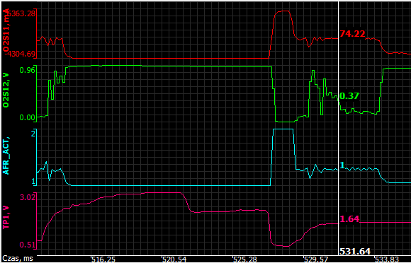 Spiesząc się aby złożyć "grata" do kupy, nie dołączyłem do wykresów jeszcze jednego zapisu – wkaźnika AFR – określającego stosunek mieszanki paliwowo – powietrznej. Idealny jest stosunek 14,7 kg powiatrza na 1 kg benzyny co stanowi wartość = 1. Powyżej tej wartości mieszanka jest uboga, poniżej jest bogata. Niestety nie zrobię już testów oryginalnej sondy. Niestety albo program FORscan albo komputer samochodu nie jest w stanie określić wartości pośrednich pomiędzy 1 i 2, choć wykres jest sinosuidalny. Wykres wygląda jakby przesunięty do góry. Podczas gwałtownego przyspieszania wykres AFR jest prostolinijny i powinien być poniżej 1 – a wskazuje na 1, po puszczeniu pedału gazu dochodzi do 2, a podczas spokojnej jezdy według osi y ma jakieś 1,3 / zdjęcie tego nie obejmuje, w tym momencie jest 1,1/ choć program widzi znowu tylko 1. Albo to wina oprogramowania albo jednak z sondą jest coś nie tak. Może podrzuci ktoś swoje wykresy AFR lub O2S11.