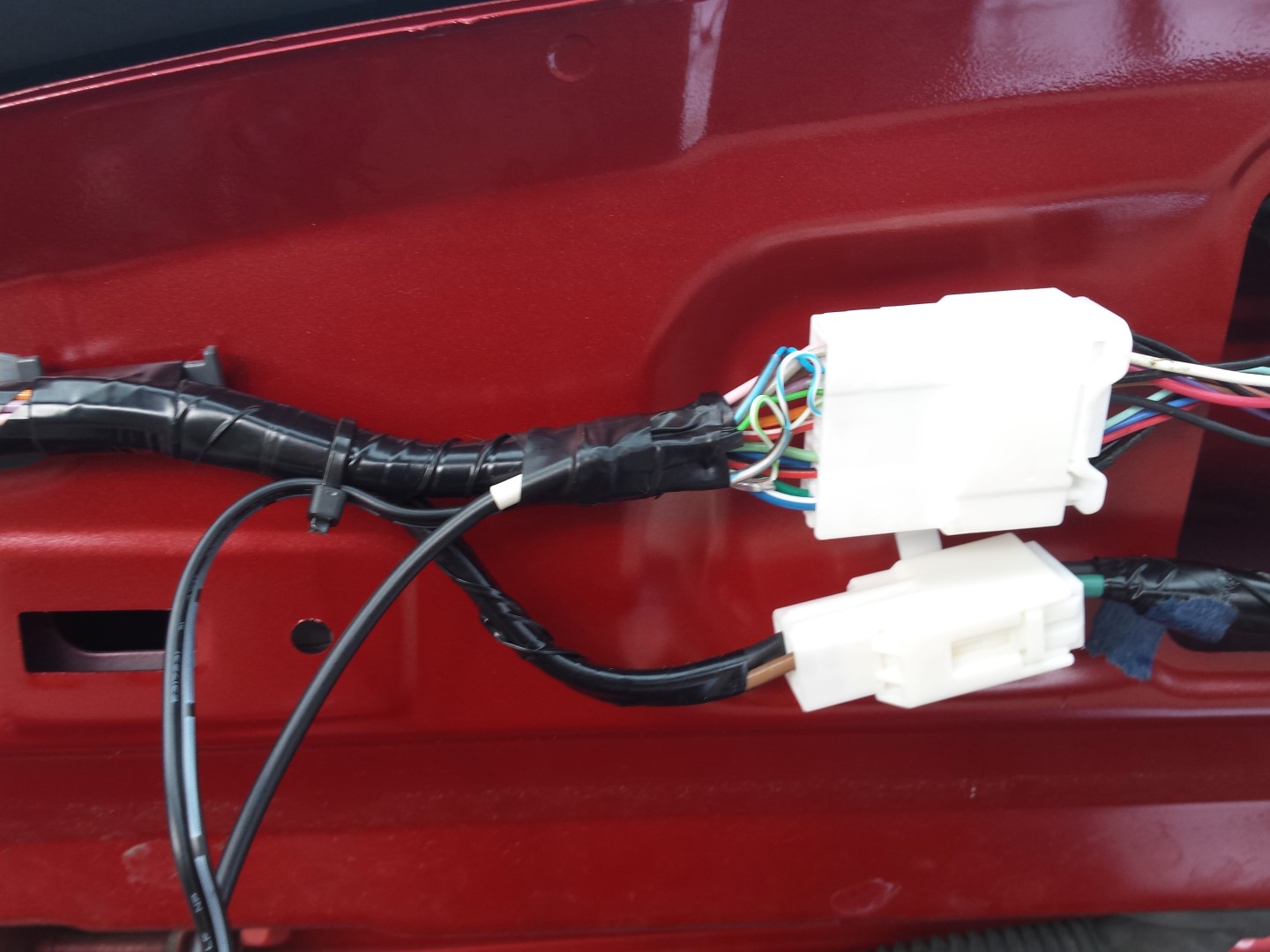 Złączki zaizolowałem taśmą, żeby się przypadkowo nie stykały z karoserią i nie rozłączyły.