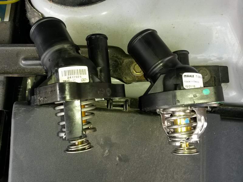 Dzisiaj wymieniłem termostat. Zrobiłem to bez ściągania paska wielorowkowego i odkręcania pompy wspomagania. Da się to spokojnie zrobić tym sposobem i moim zdaniem jest dużo szybciej. Wystarczy mała grzechotka z przedłużkami. Spokojnie odkręciłem termostat, a potem go wysunąłem aby mieć dostęp do metalowych obejm na wężach. Najpierw ściągnąłem mniejszy, potem większy. Od otwarcia maski do zamknięcia 2h bez pośpiechu.