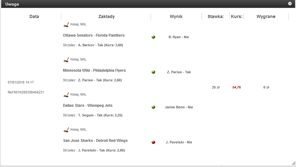 Dzisiaj bogata oferta NHL, ale ja tym razem bez wyskoków w single i gram 2x System Canadian tzn. 2x26 kombinacji, gdzie stawka łączna to 130 zł Maksymalne wygrane spore, ale przy tego typu systemie liczę na realny urobek w okolicach 1k z całości. A jak będzie, to pokaże tafla. Good luck!
