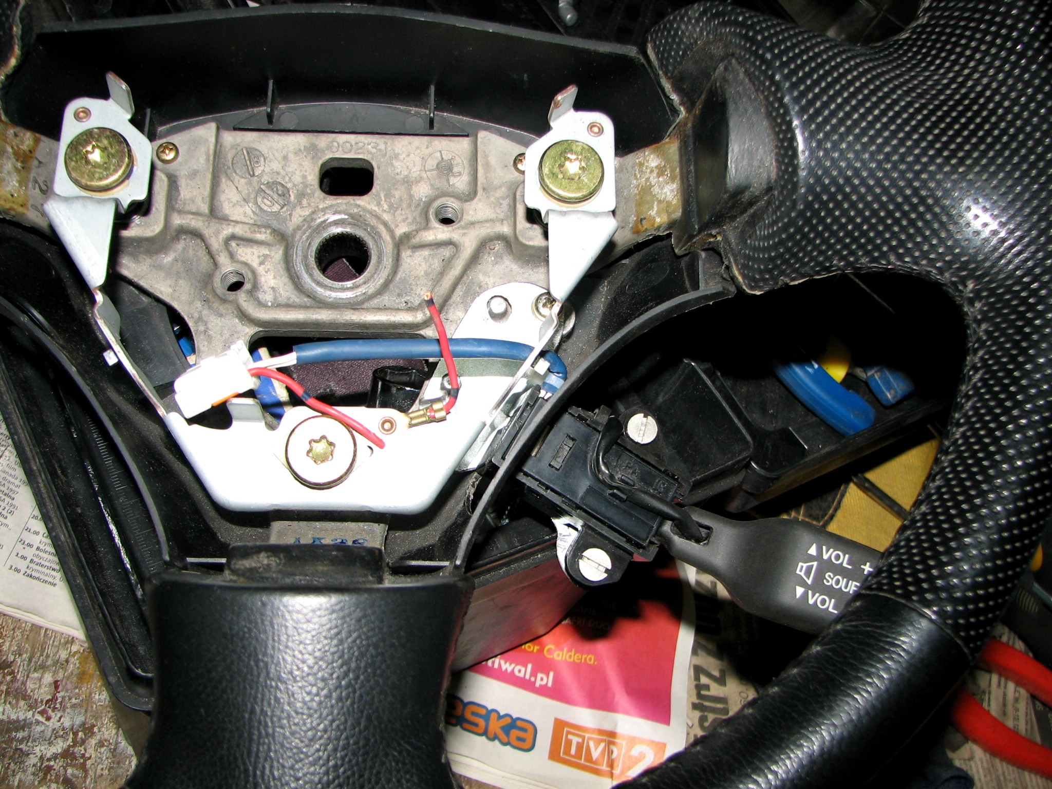 Z tą kierą, wszystko fajnie, ładnie, pięknie, ale jest małe "ale" – okazało się, że ma ona sterowanie, ale nie do radia, a do tempomatu (doszedłem do tego z netu). Zacząłem przekładać przewody w wiązce i robić pomiary oporności po załączeniu funkcji, radio zaczęło reagować, ale na odwrót (np. zamiast ściszać było głośniej) nie jest to zbyt wygodne, po za tym brakuje mi przycisku "source" (przełączanie źródła dźwięku), który był w sterowaniu w starej kierownicy. Jest tylko funkcja "mode" – czyli blokowanie wszystkich przycisków – jak dla mnie mało przydatna. Bo głębszych przemyśleniach stwierdziłem, że najlepszym wyjściem będzie przekładka samego sterowania ze starej kierownicy. Ta wajha – pilot była jednak bardziej jak to się mówi ergonomiczna <diabełek>