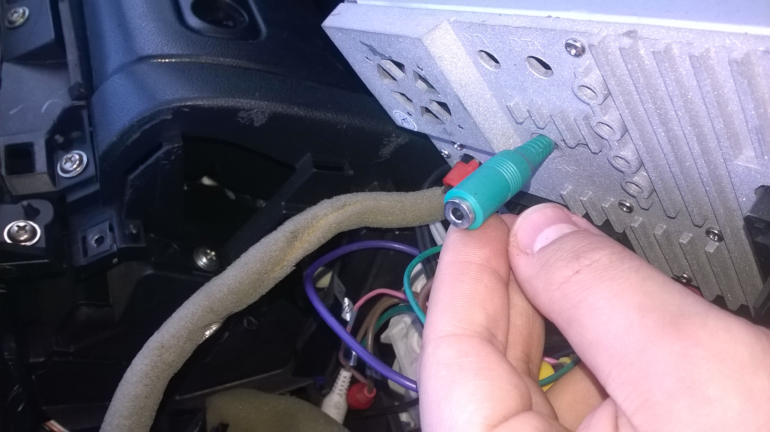 Dwa dodatkowe przewody z wtykami USB doprowadziłem do pojemnika na napoje przy ręcznym (nie trzeba wiercić żadnych otworów). Dzięki temu można podłączyć np. pendrive i nie wystaje on z radia tylko ładnie schowany jest w schowku.