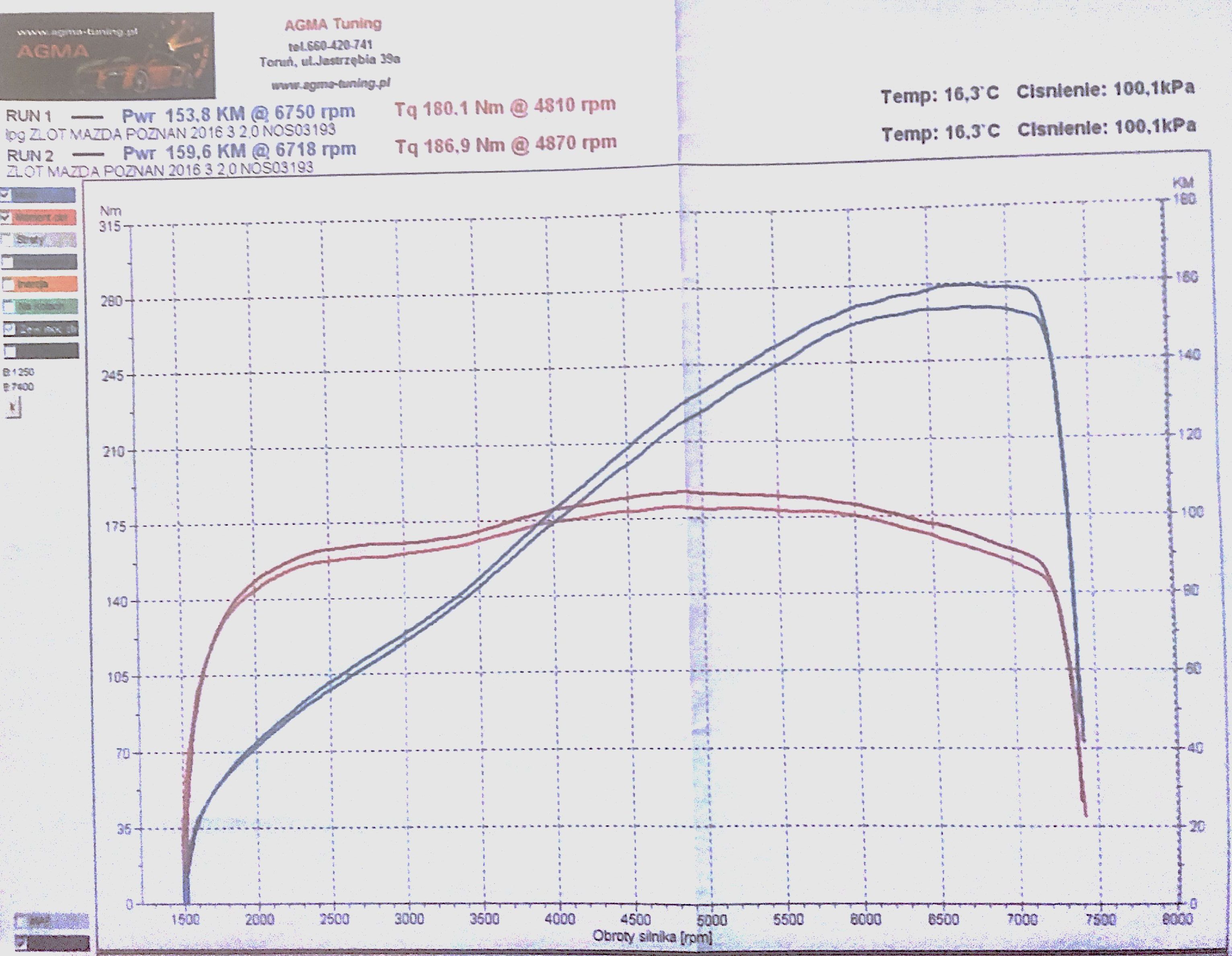 Mazda została dwukrotnie zhamowana (na benzynie i na LPG). O ile wynik na benzynie (159,6KM 186,9Nm) jest bardzo zadowalający o tyle z różnicy wyszło, że na gazie jest jednak cały czas delikatnie za ubogo (153,8KM 180,1Nm). Potwierdziłem to wczoraj, robiąc trasę 600km głównie po autostradzie z prędkościami przelotowymi 150-200km/h – po dłuższym odcinku takiego pociskania jednak wyrzuciło check. Nie długo serwis gazowy, więc przy okazji zmiany filtrów powiem, żeby postroili i trochę dolali