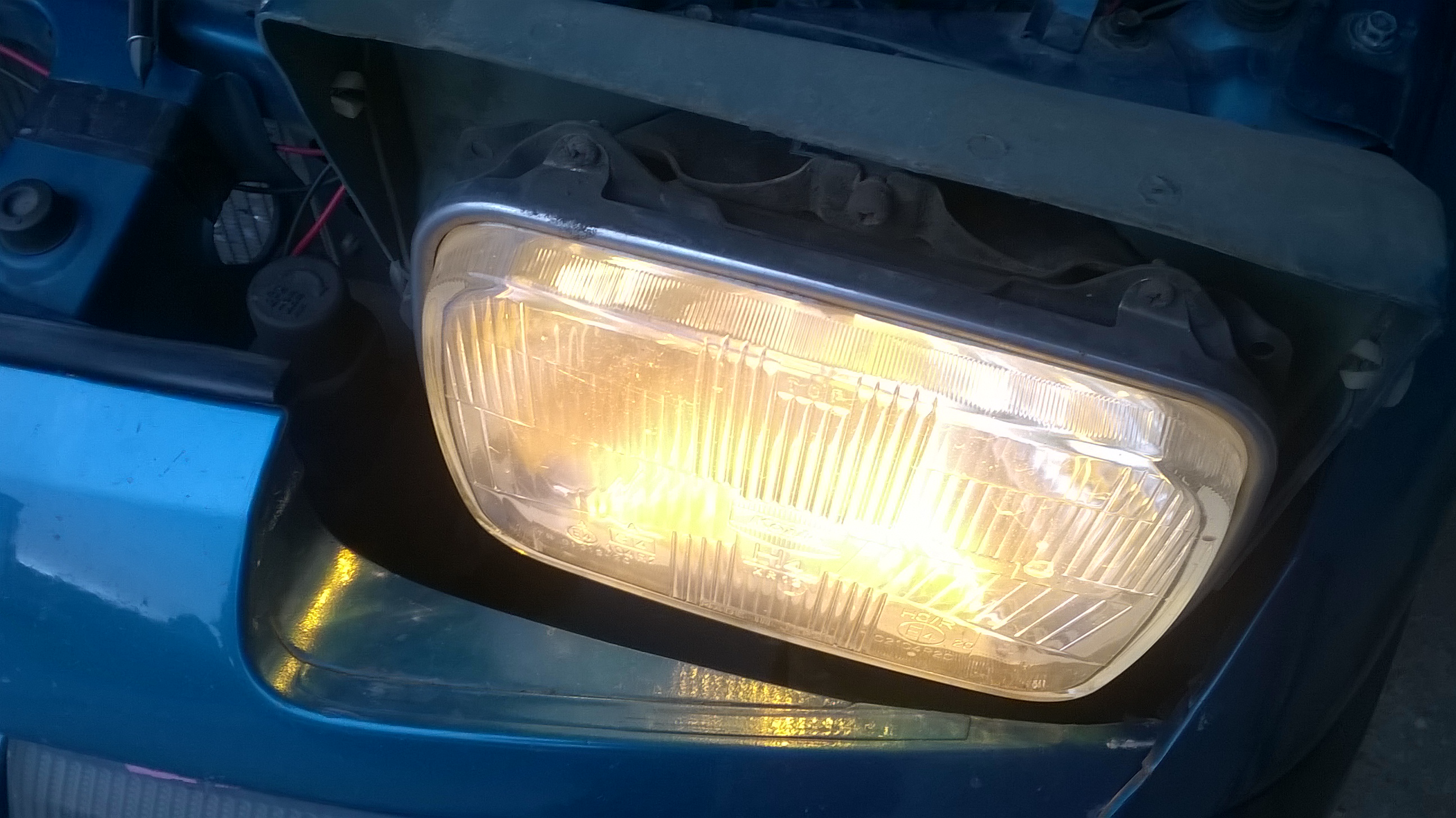 Dorwałem halogenki , które służą mi jako światła do jazdy dziennej. Dodatkowo okleiłem je folią holograficzną – żółtą . I odziwo policja się nie czepia ale pewnie do czasu aż nie trafi się taki co krzywo położony dywanik się przyczepi :-D Aby dodać jeszcze więcej wyglądu retro mojej Madzi zamontowałem też żarówki Bosma żółte retro style :–)