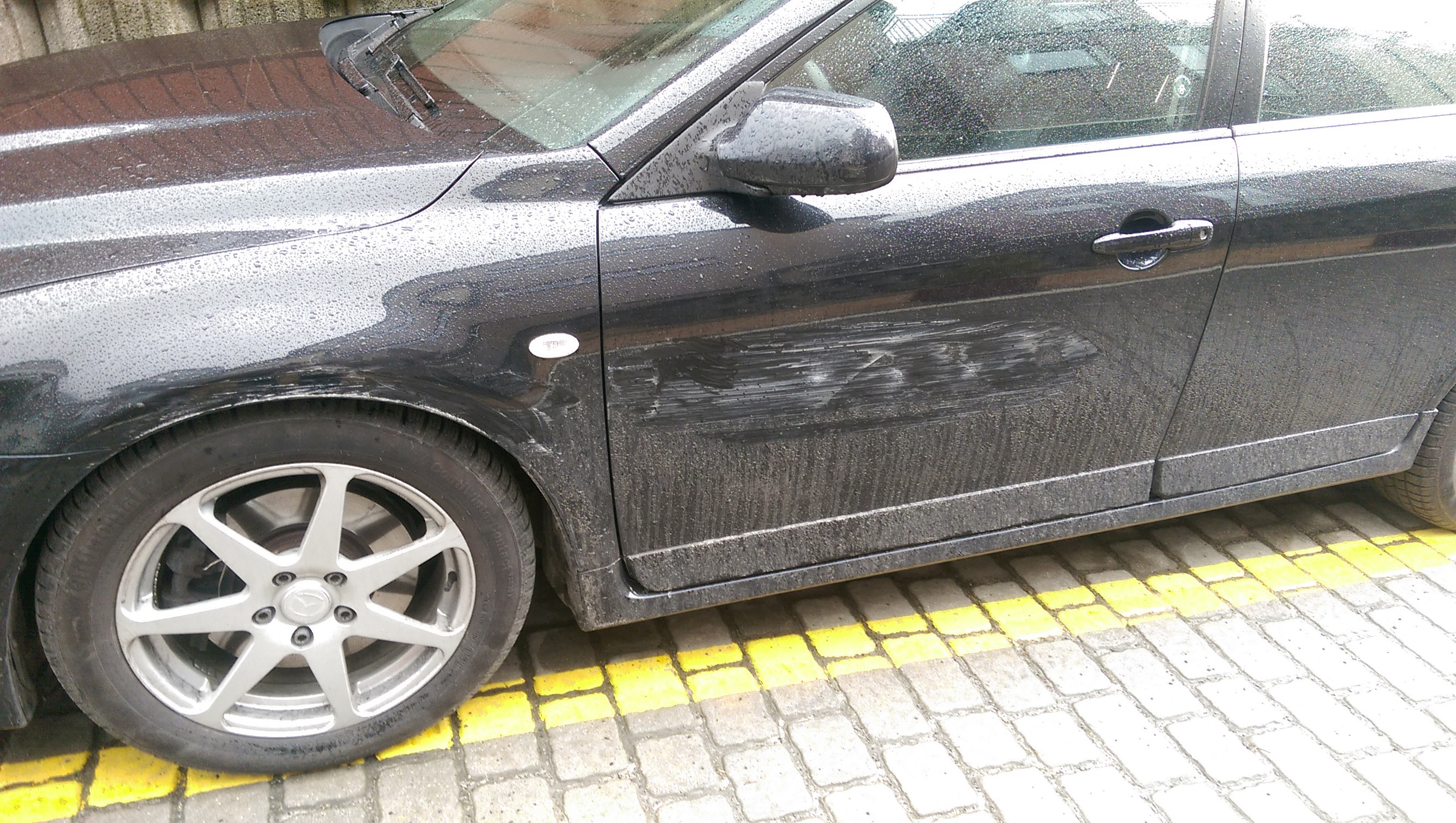 Jakoś się z tym pogodziłem, dopóki pod koniec marca nie wyszedłem z domu, podszedłem do samochodu i zobaczyłem widok jak poniżej. Ktoś przejechał mi się po drzwiach, sprawcy brak – "nosz ku*** mać"! ;P.