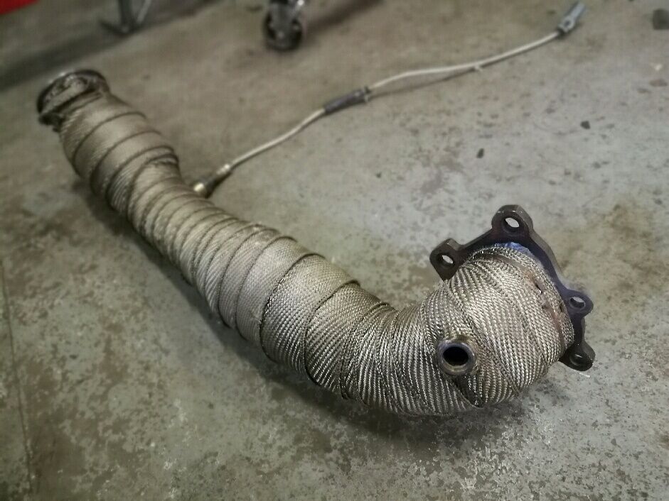 Poniżej downpipe ze sportowym katem, całość owinięta bandażem termicznym: