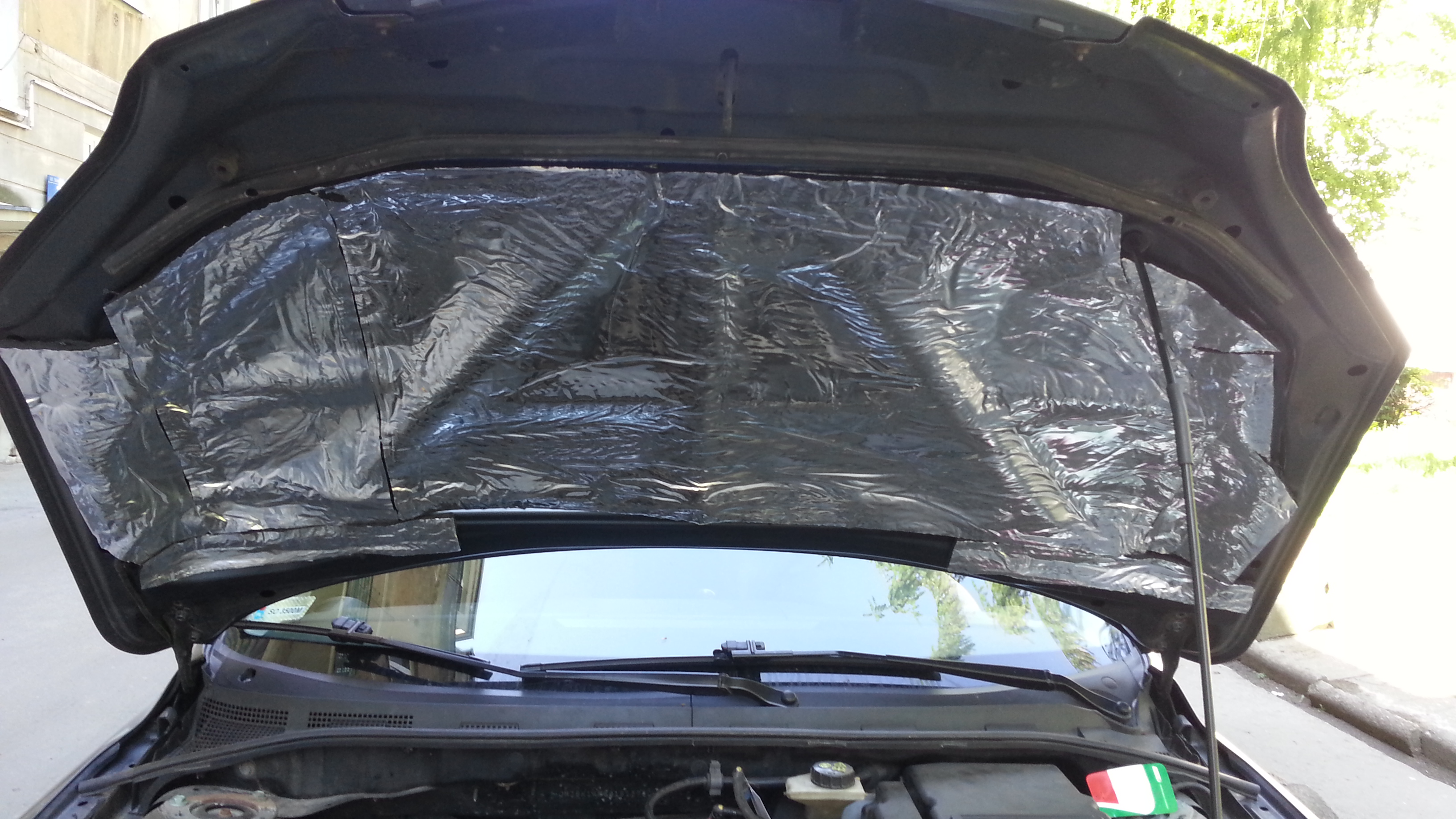 Wyciszania ciąg dalszy, dzisiaj była grana maska. Na początek poszła mata STP Silver i mata z bitmatu (dostałem do spróbowania nową ulepszoną wersje i faktycznie była dużo lepsza niż ta poprzednia – papier również był grubszy i nie rwał się tak). Na to poszła pianka GMS 010 – trudnopalna, z mocniejszym klejem i warstwą aluminium. Mam w planach dołożyć jeszcze trochę pianki (jakieś 0.2 m2), bo niestety brakło mi trochę. W planach jest jeszcze dołożenie dwóch uszczelek po bokach żeby zamknąć zupełnie komorę silnika i położenie STP Silver na komorę silnika od strony kabiny. Ta druga opcja wymaga niestety rozmontowania wielu kabli i rozważenia warto położyć maty