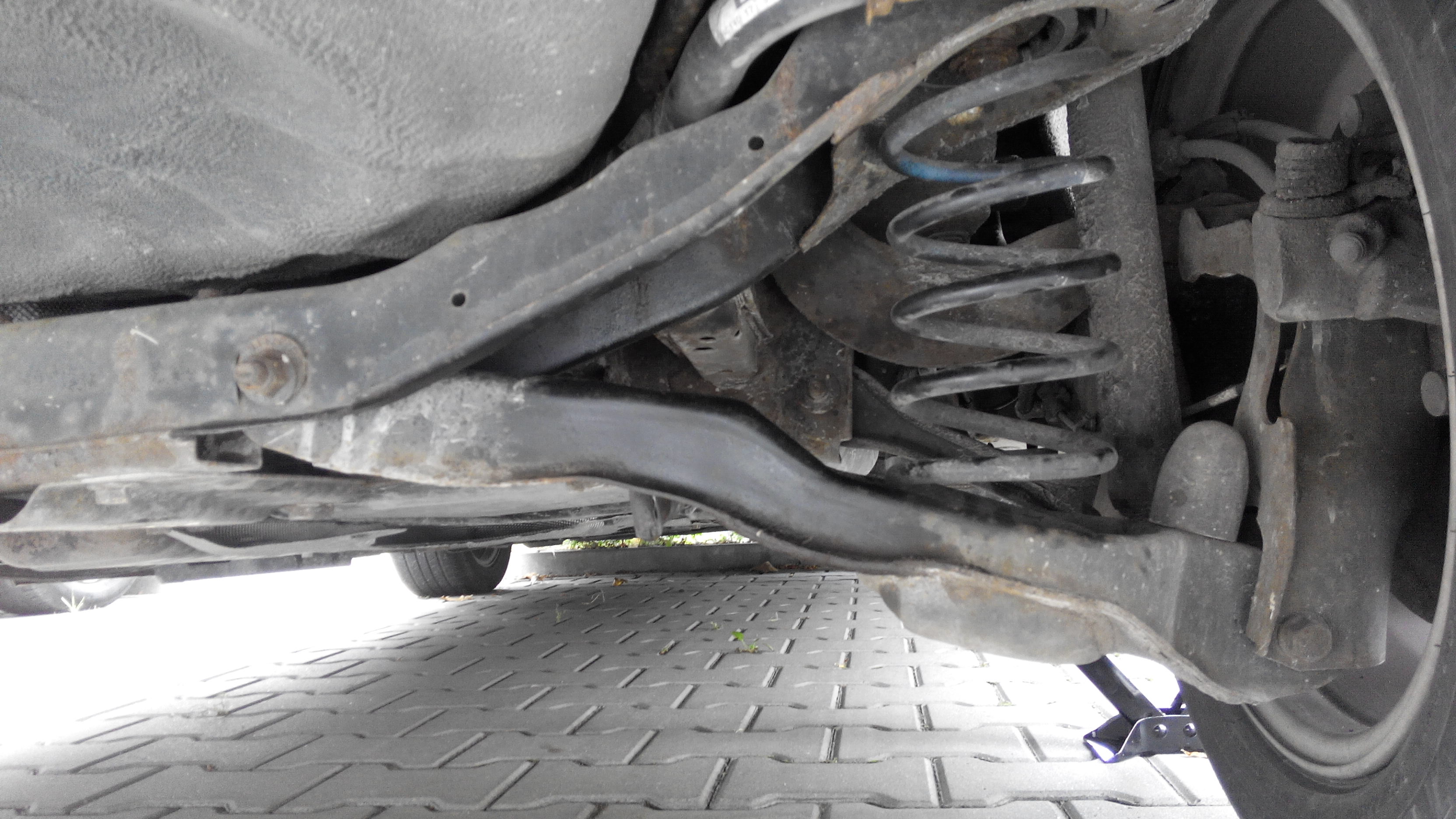 Teraz ważne – samo odkręcenie może nie wystarczyć do demontażu starego łącznika. W moim przypadku przeguby były już na tyle luźne że się udało go zdemontować ręcznie. Gdyby u was był problem lewarek należy podeprzeć pod wahacz, tak jak na zdjęciu: