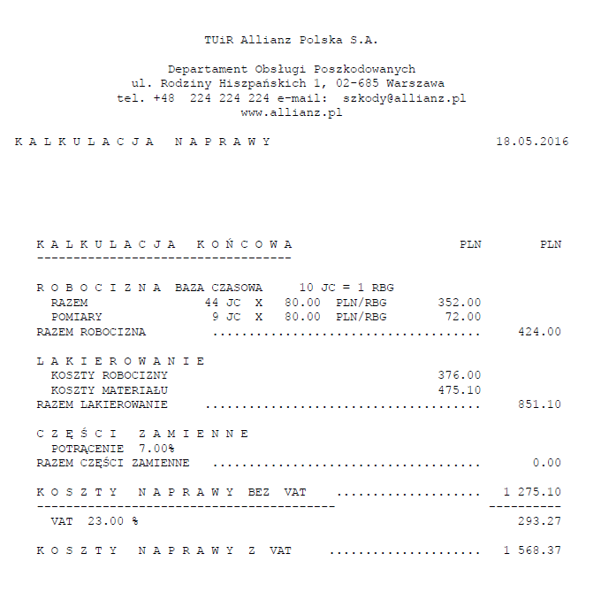 "Informujemy, że podana powyżej suma stanowi wartość odszkodowania z tytułu kosztów naprawy