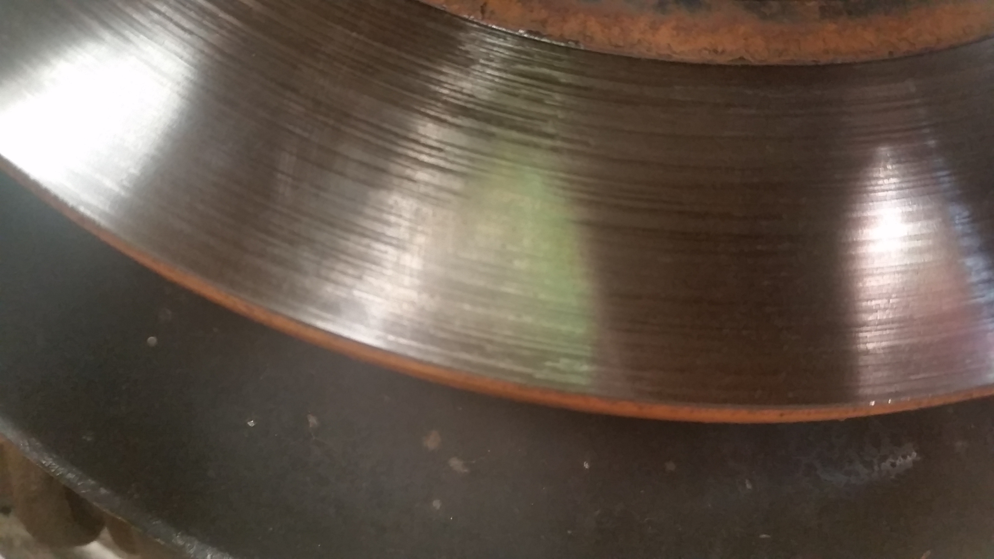 Załączam zdjęcia tarcz. Może się wydawać, że (poza tymi dużymi rowkami) są w podobnym stanie, ale na dotyk tylna jest wyraźnie gładsza i ma mniejszy rant (a przejechała 3 razy tyle co przednia). Te rowki na przedniej wyglądają na moje niefachowe oko tak, jakby jakiś mały kamyczek się dostał pod klocki.