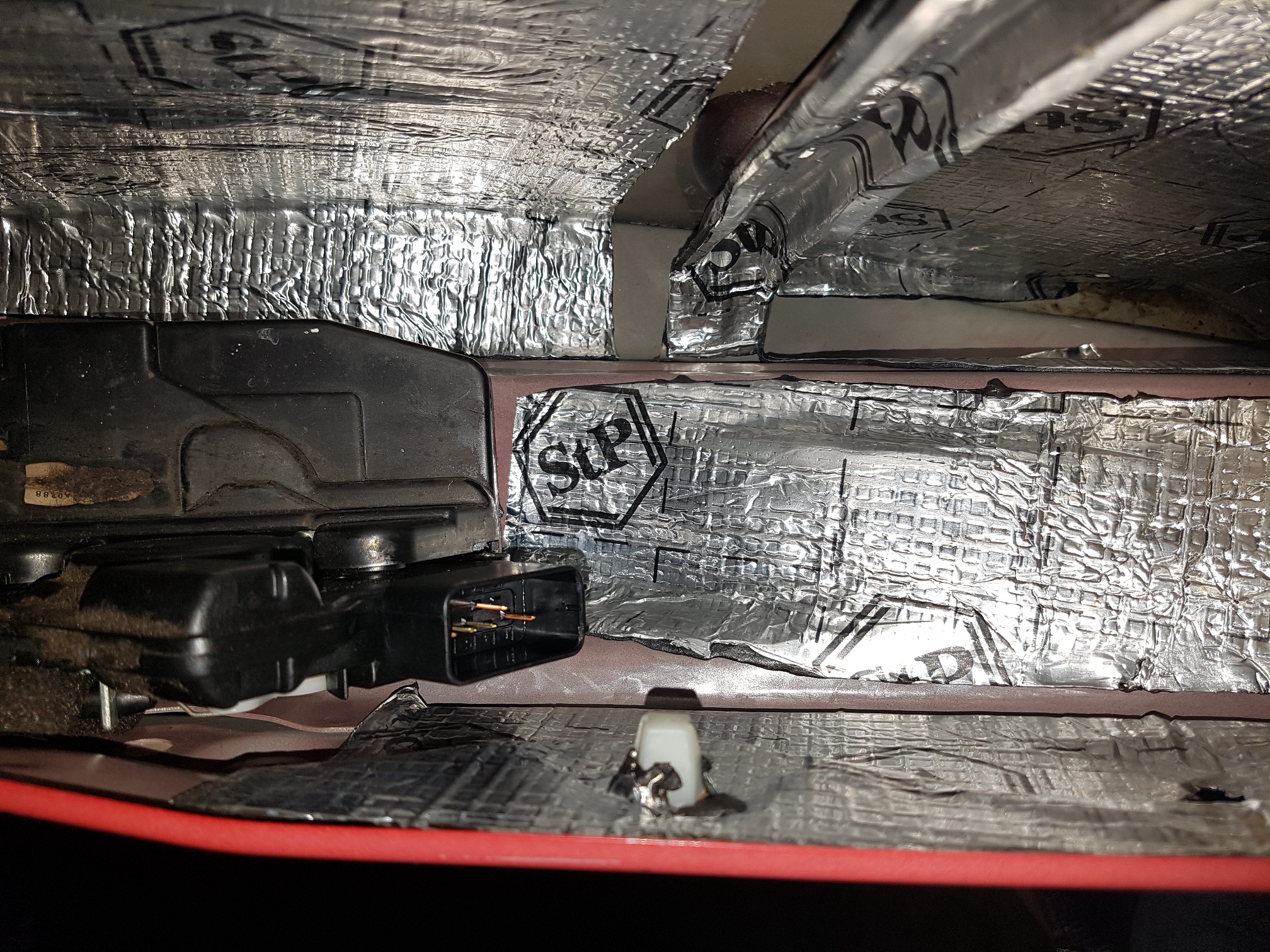 Oprócz tego, co widać na zdjęciach, zasłoniłem jeszcze matą alu-butyl trójkąt lusterka oraz otworzy technologiczne w boczku/poszyciu wewnętrznym drzwi. Na jednym ze zdjęć widać, że zasłoniłem też otwór technologiczny od środka drzwi – stwierdziłem, że tak będzie lepiej, ale niezbyt "po bandzie" jak to czasami piszą żeby to blachą maskować.