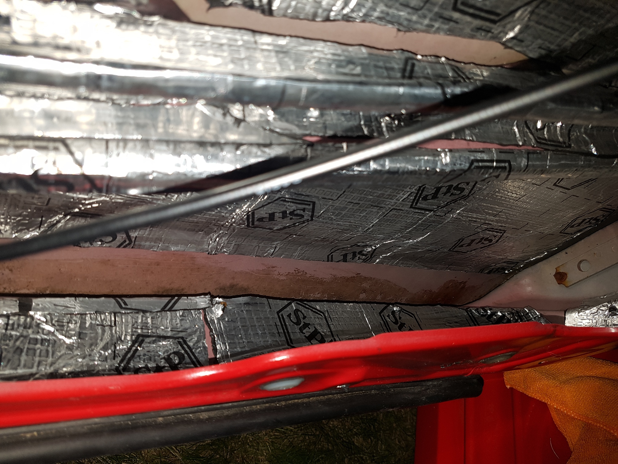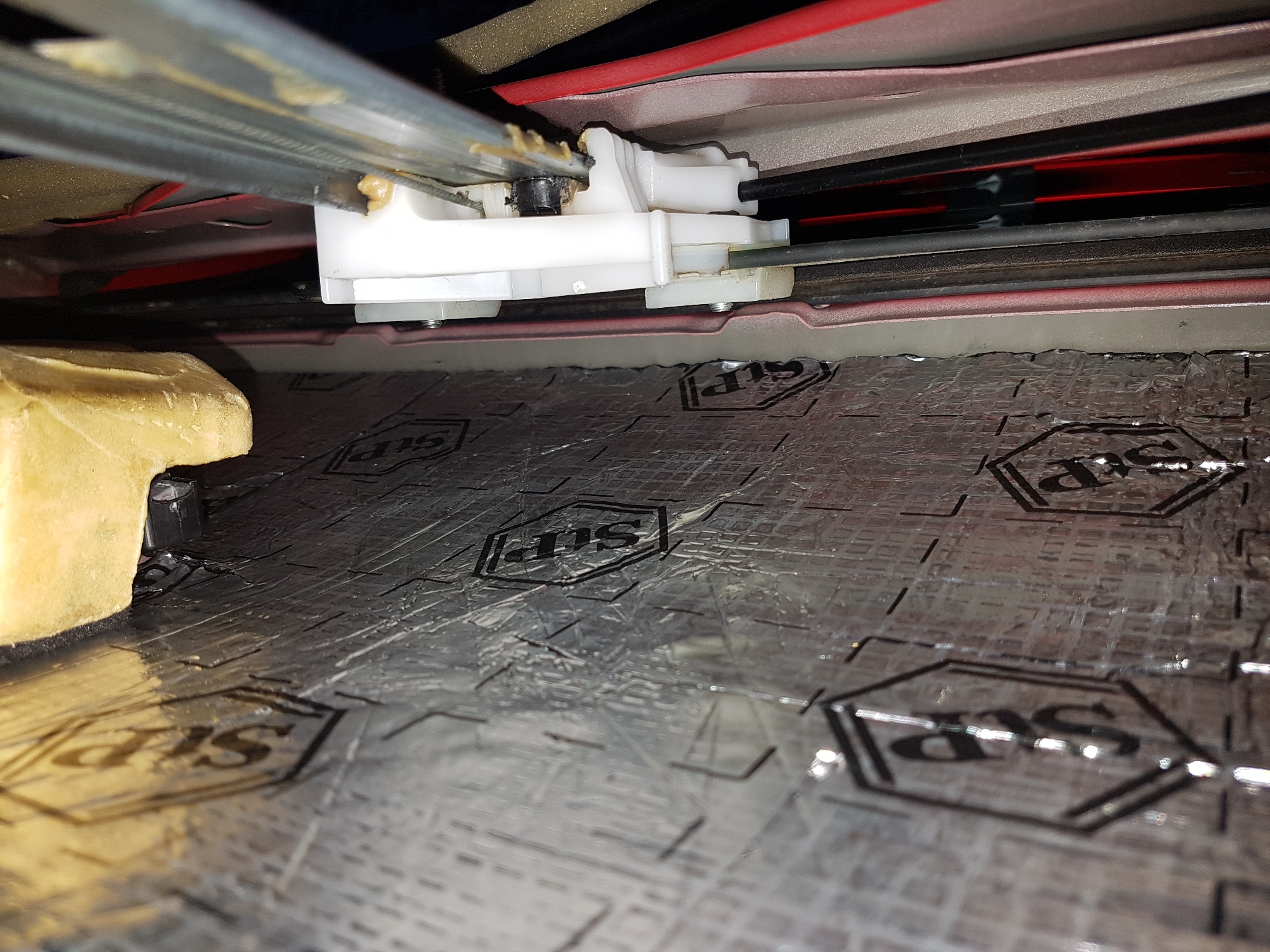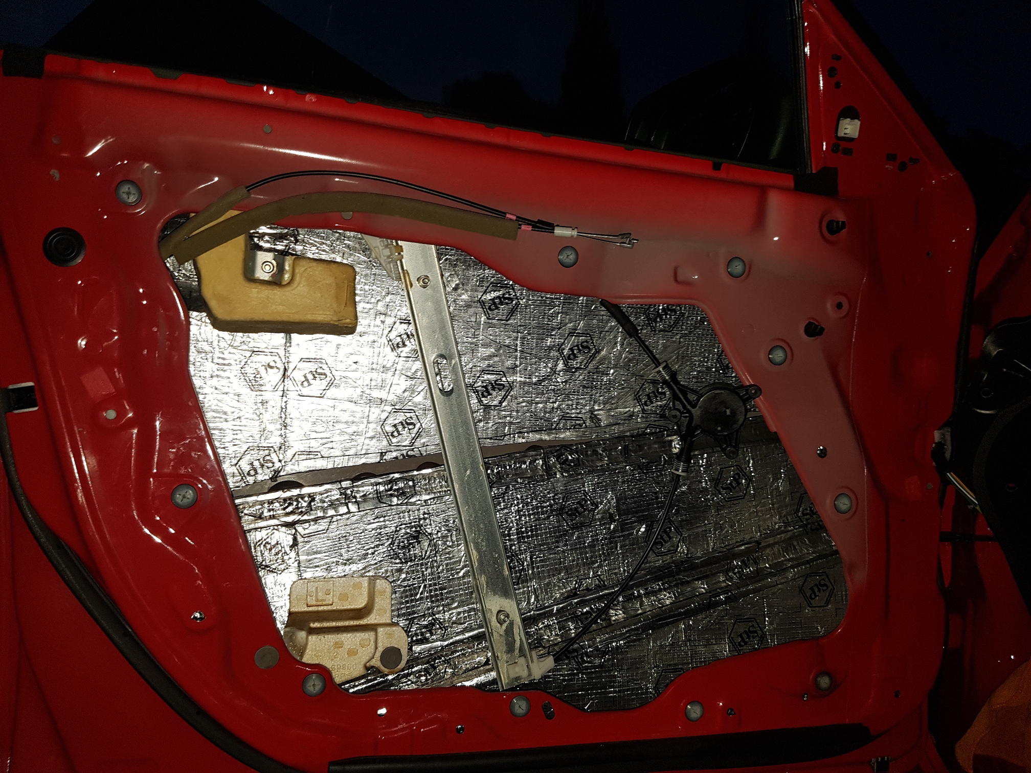 Oprócz tego, co widać na zdjęciach, zasłoniłem jeszcze matą alu-butyl trójkąt lusterka oraz otworzy technologiczne w boczku/poszyciu wewnętrznym drzwi. Na jednym ze zdjęć widać, że zasłoniłem też otwór technologiczny od środka drzwi – stwierdziłem, że tak będzie lepiej, ale niezbyt "po bandzie" jak to czasami piszą żeby to blachą maskować.
