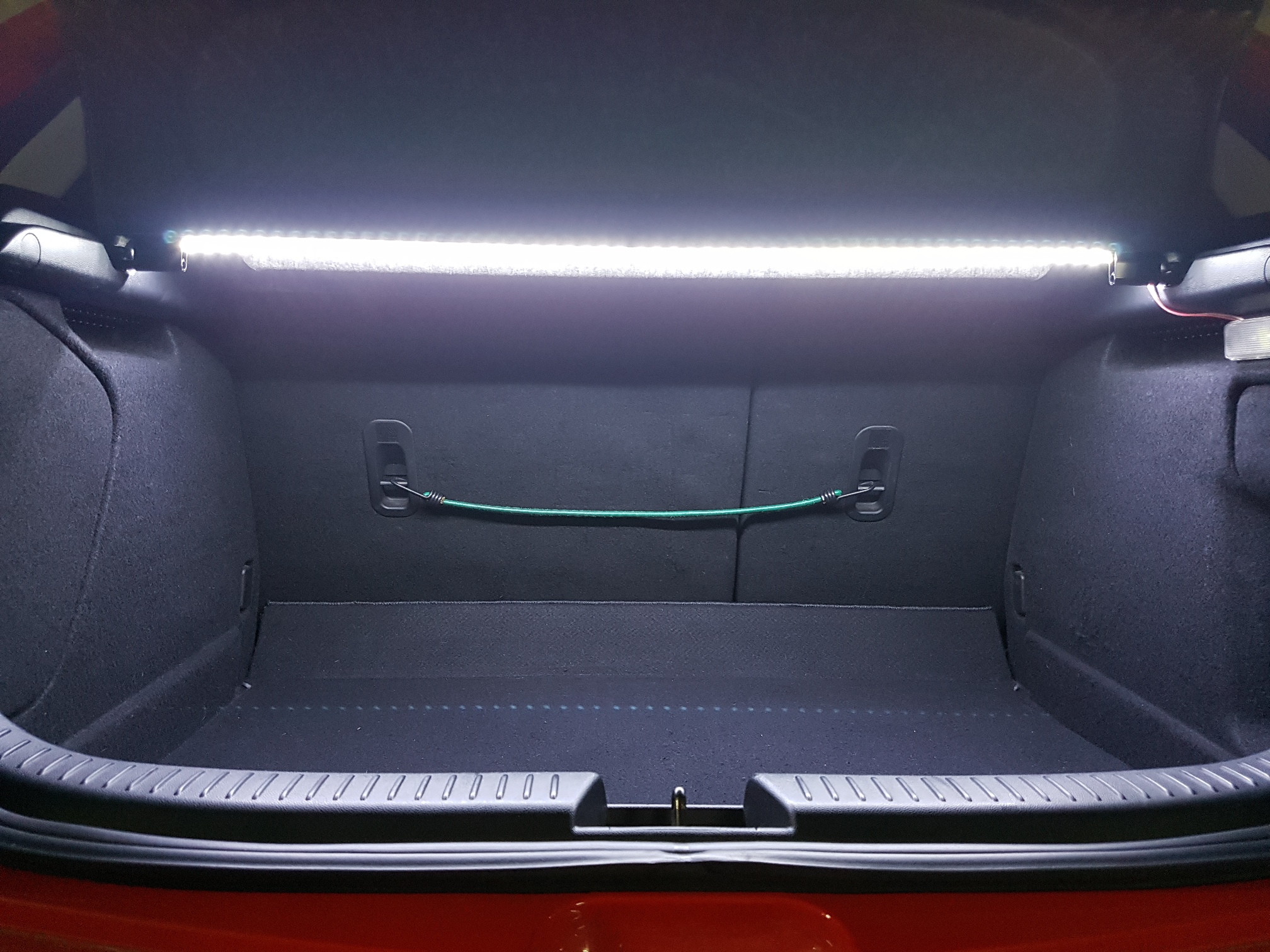Z ostatnich modów – wpadły ledy do bagażnika. W końcu wszystko widać. Muszę jeszcze tylko wkleić gniazdko na wtyczkę obok lampki, żeby można było odłączać ledy przy wyjmowaniu półki.