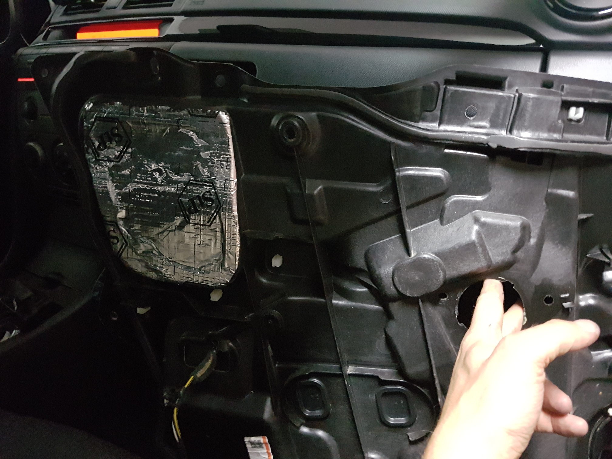 Oprócz tego, co widać na zdjęciach, zasłoniłem jeszcze matą alu-butyl trójkąt lusterka oraz otworzy technologiczne w boczku/poszyciu wewnętrznym drzwi. Na jednym ze zdjęć widać, że zasłoniłem też otwór technologiczny od środka drzwi – stwierdziłem, że tak będzie lepiej, ale niezbyt "po bandzie" jak to czasami piszą żeby to blachą maskować.